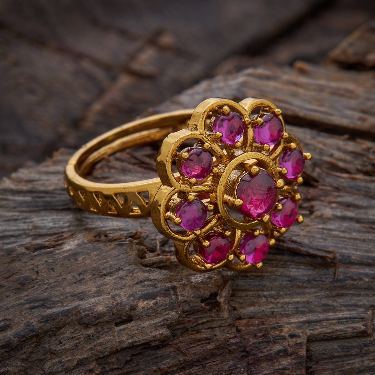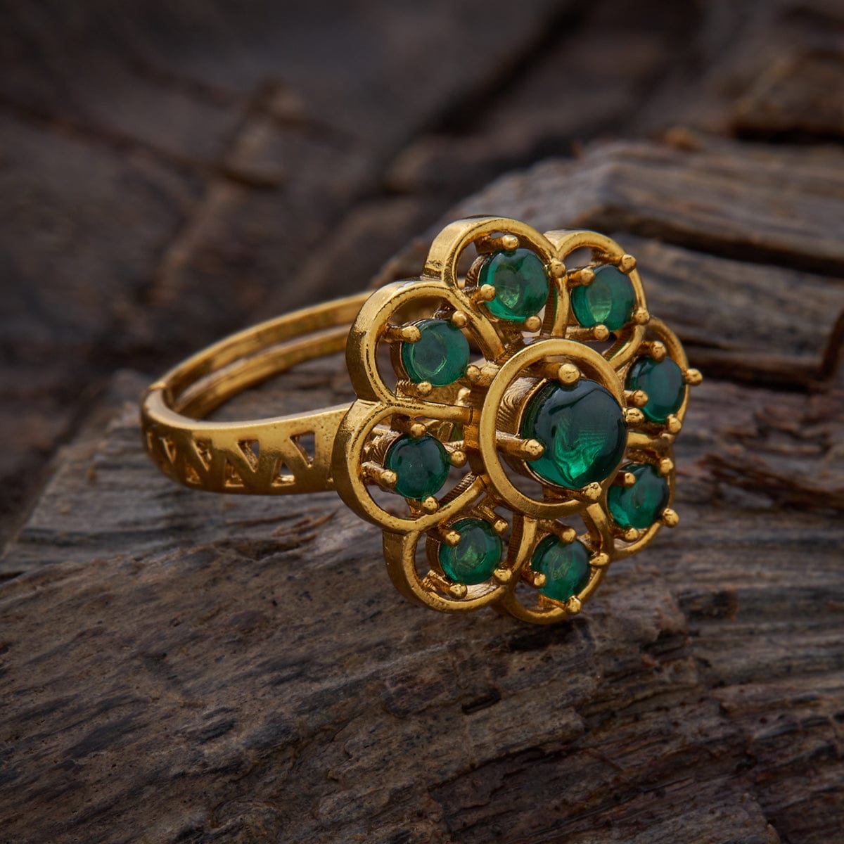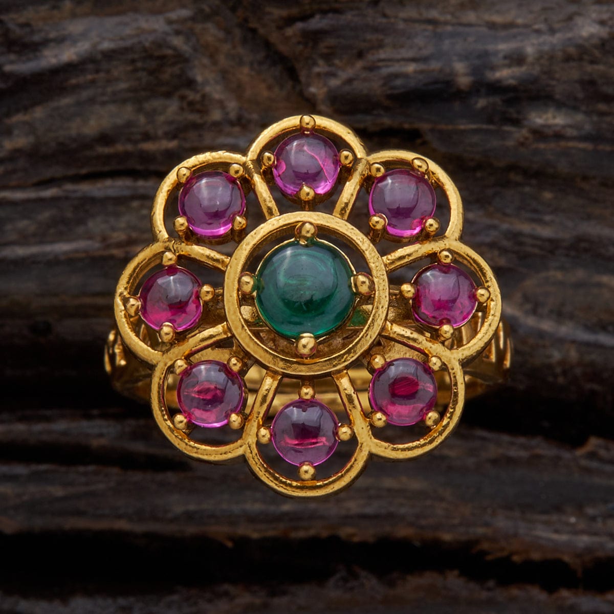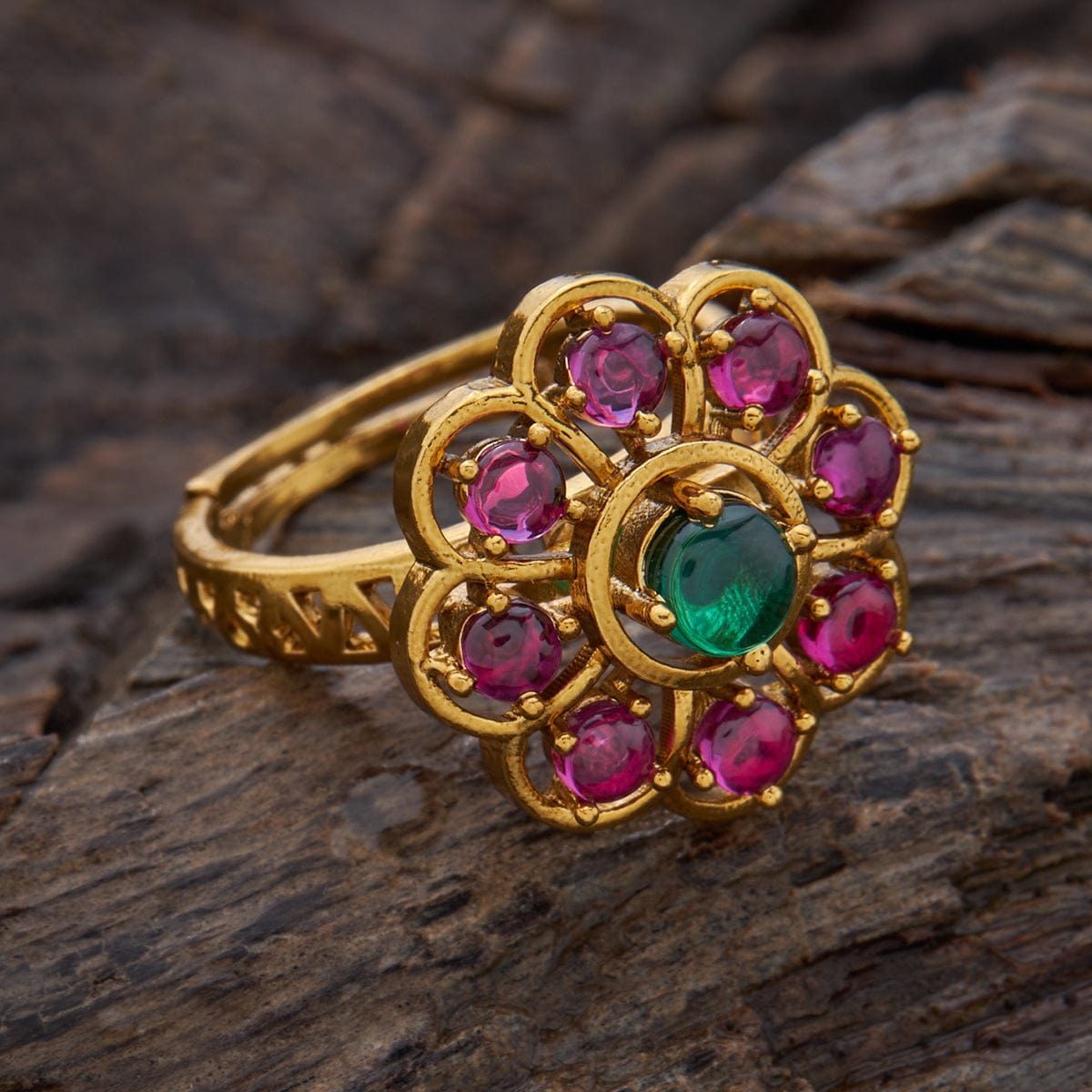 This lightweight yet eye-catching ring features a unique design that will set you apart from the crowd. Crafted with a copper alloy base metal and striking gold polish, it is both durable and strikingly beautiful. The synthetic stones in four stone colours- green, navaratna, ruby, and ruby green beautifully add a touch of elegance that will perfectly complement any outfit. With its intricate flower pattern, this ring will make your hand shine.