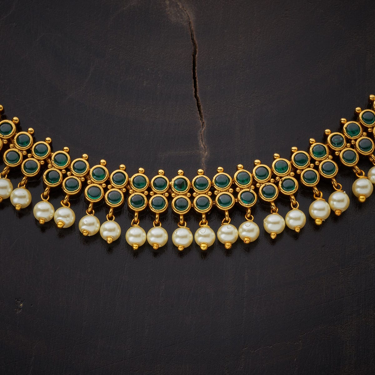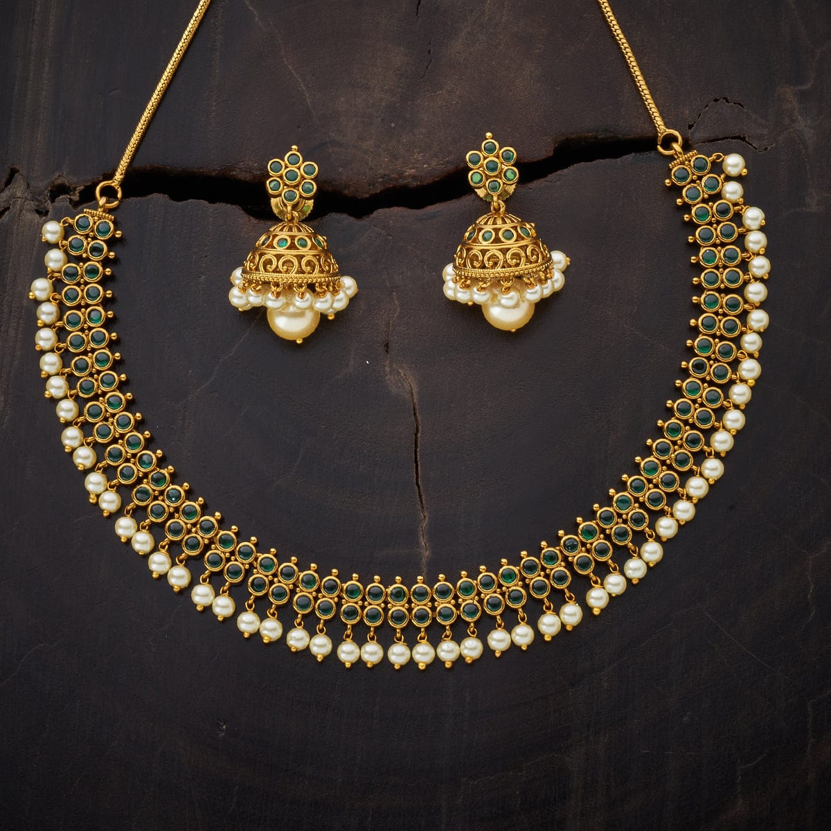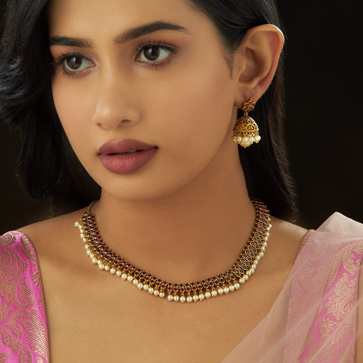With a ravishing pattern on the short necklace and a pair of matching jhumka earrings, this jewellery set with an antique touch will make you the show-stopper wherever you go. Embellished with ruby and green stones set in a linear pattern and hanging beads, it is plated in gold. This necklace set has a distinctive charm and is perfect for wedding seasons.