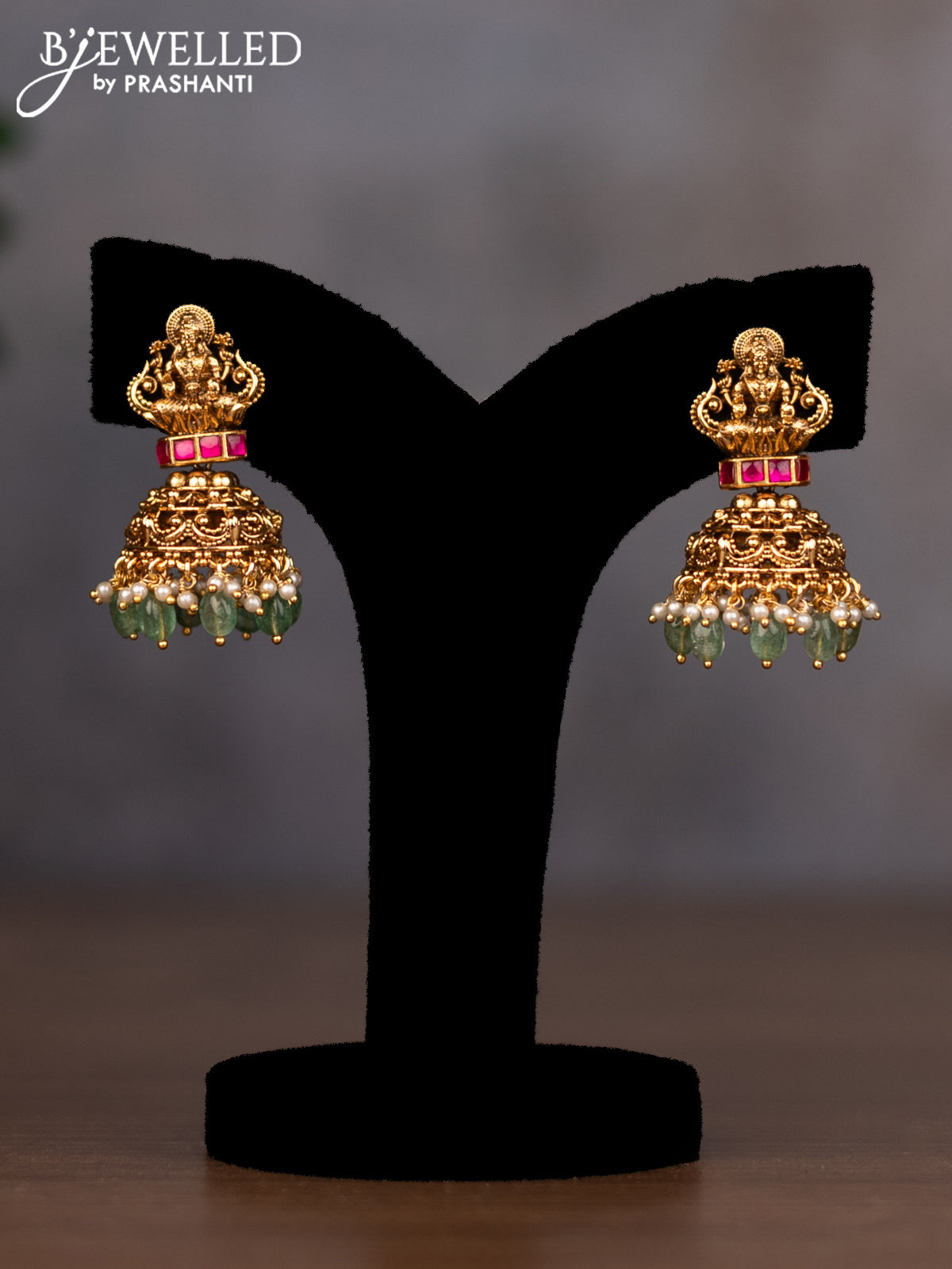 Antique necklace lakshmi design with pink jadau stones and green beads hanging
