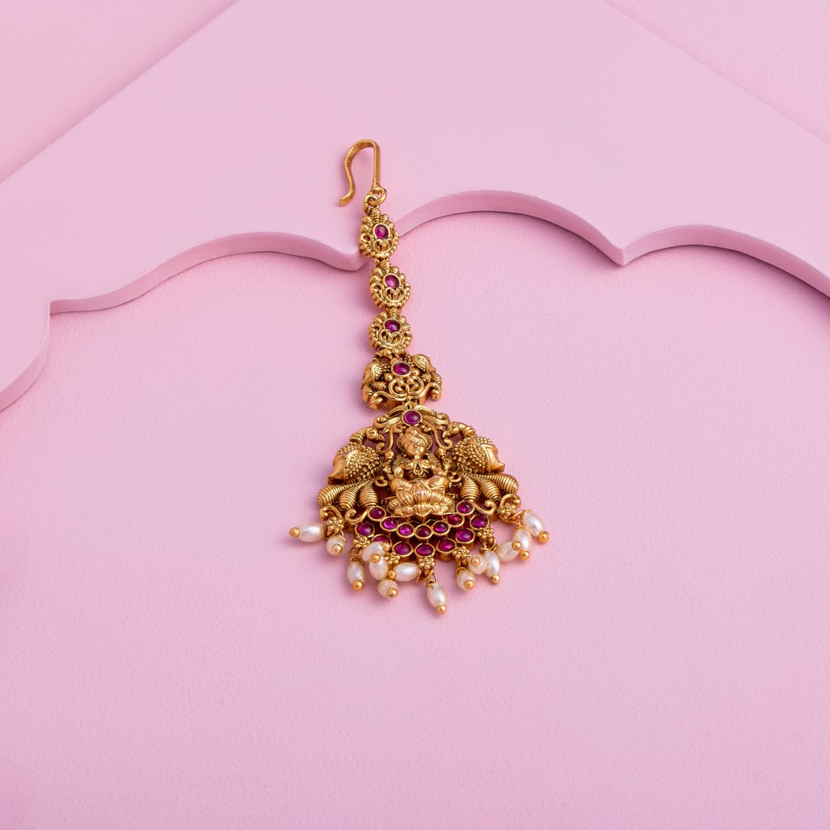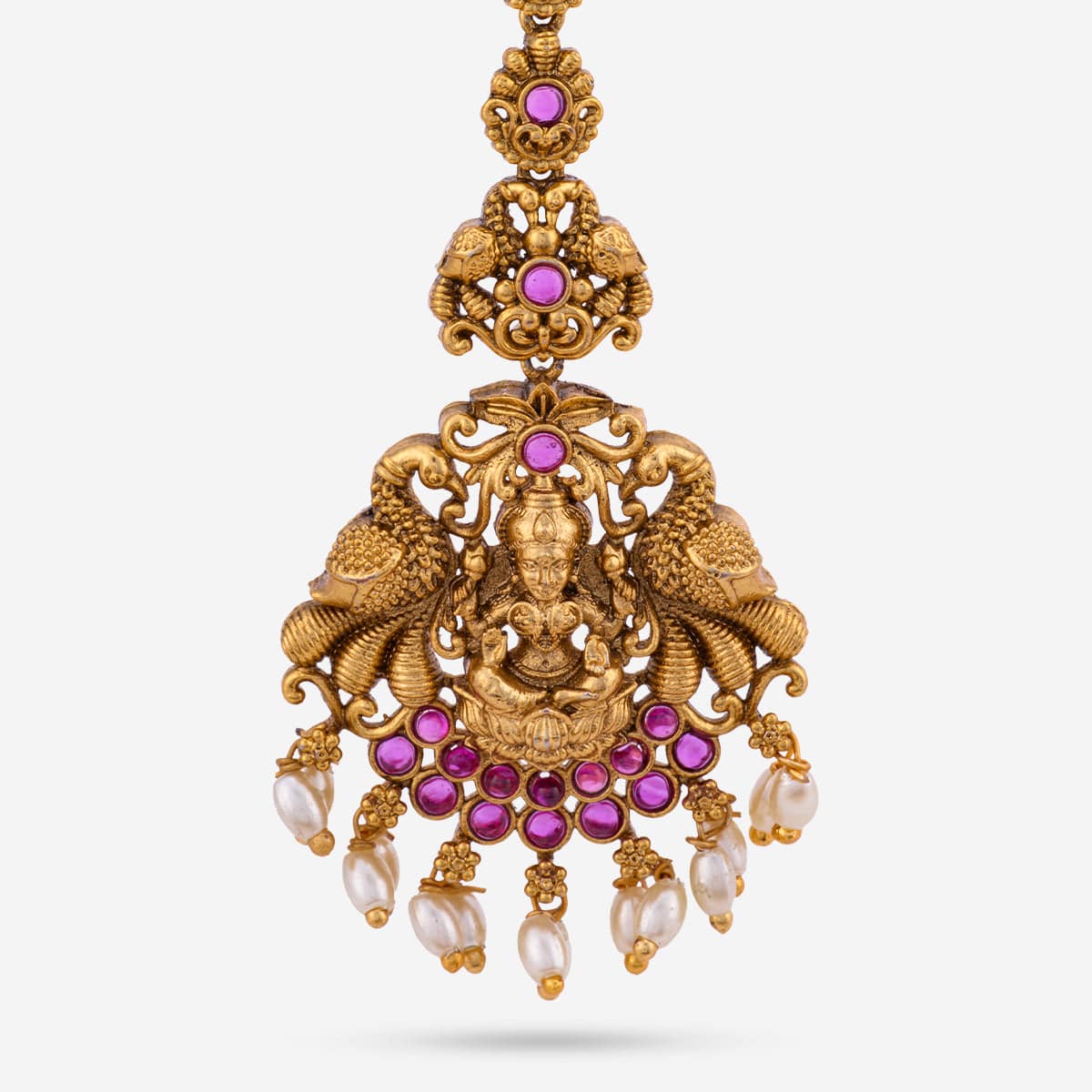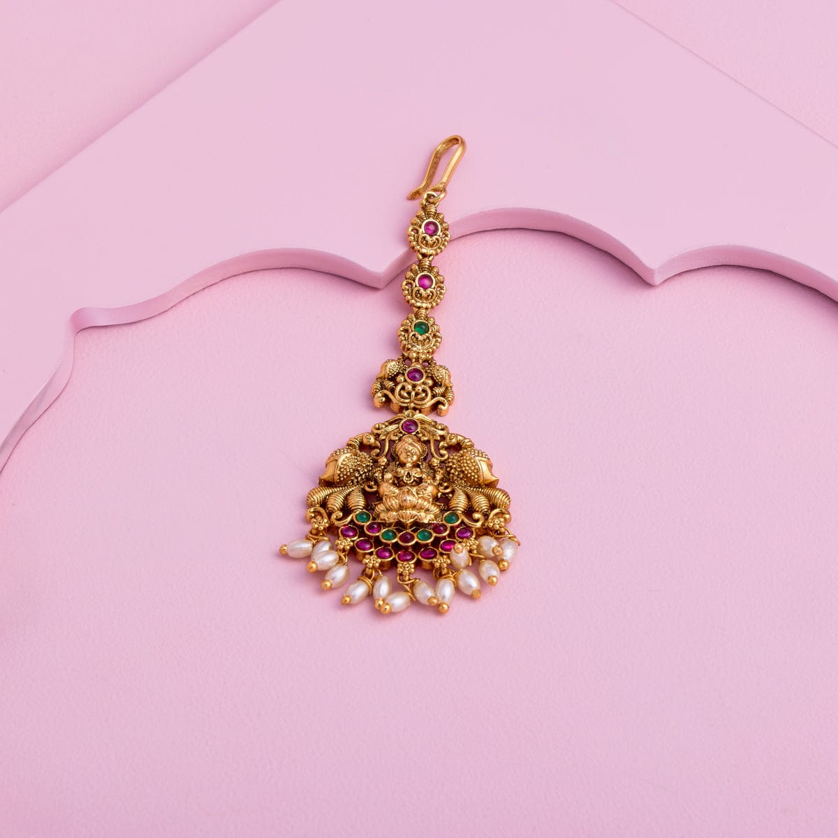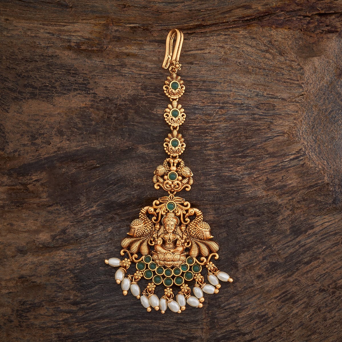 An exquisite antique tikka crafted from premium copper alloy, adorned with green, ruby, or green-ruby synthetic stones and beads is all you need to elevate your fashion game. At its centre lies a captivating Goddess Lakshmi design, adding both spiritual significance and unique allure, perfectly enhancing traditional attire with elegance.