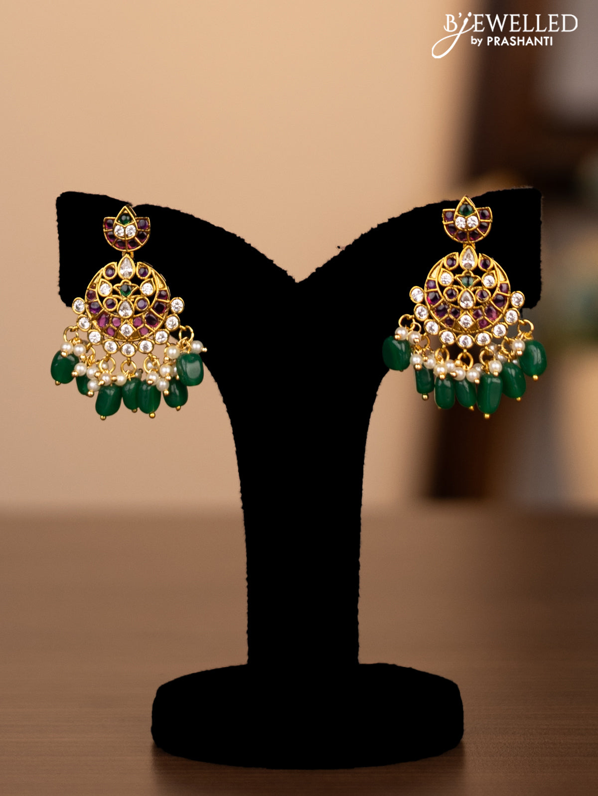 Antique triple layer haaram manga pattern with kemp & kundan stones and natural green beads & pearl hangings