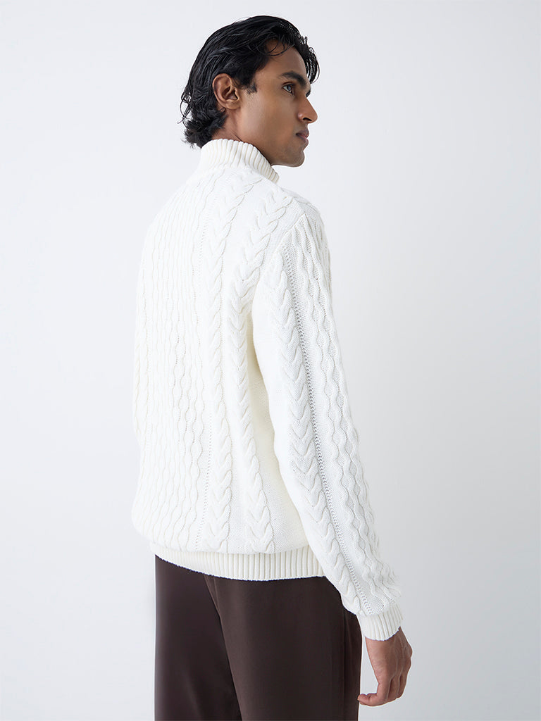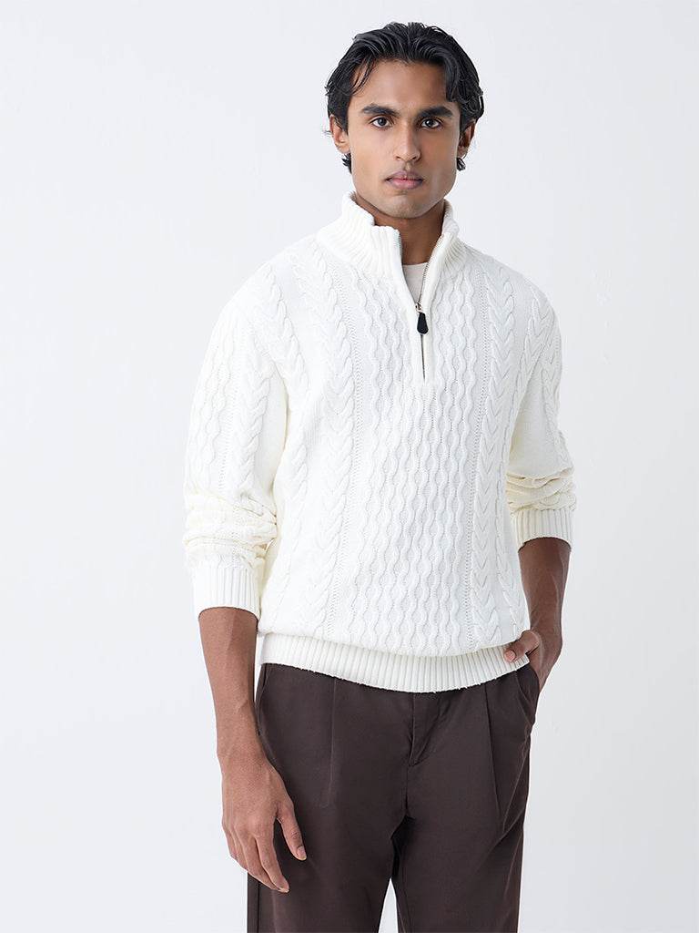 Ascot presents this off-white sweater featuring a high neck, a short zipper closure and full sleeves for a clean, structured look. Knitted from pure cotton fabric, it is finished with a cable-knit pattern that brings depth to the design. Soft, warm and effortlessly stylish, it stands out as a dependable choice for the winter season.