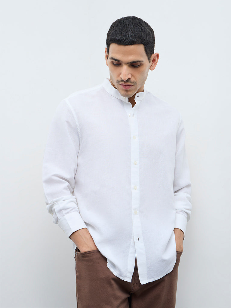 Designed to slot easily into daily rotation, this white shirt from Ascot carries a quietly refined appeal. Cut in a relaxed fit, it features a band neck with a buttoned placket and full sleeves for a clean, composed look. Crafted from a soft lightweight fabric, it delivers breathable comfort throughout the day.