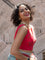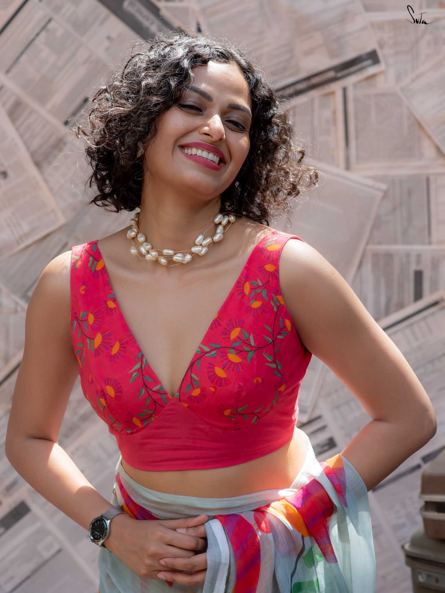 This pink floral cotton blouse hugs you just right, with a sleeveless cut that lets your confidence shine. V-neckline frames you beautifully, while the back hook closure keeps it sleek and chic.