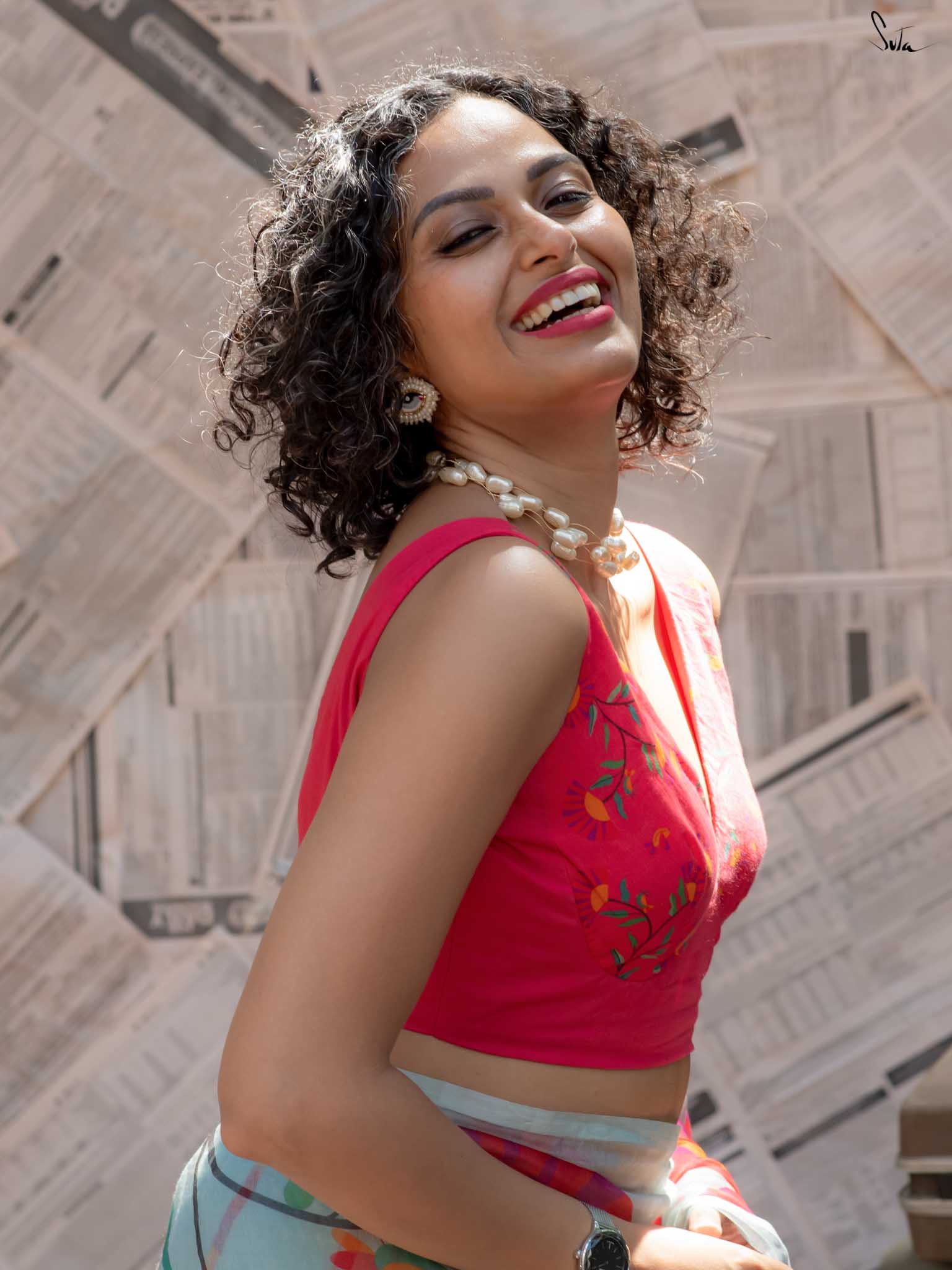 The model is wearing size S blouse and the saree is Wild Whims