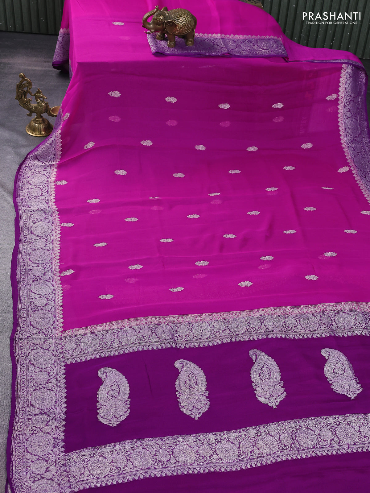 Banarasi chiffon silk saree pink and purple with silver zari woven buttas and silver zari woven border