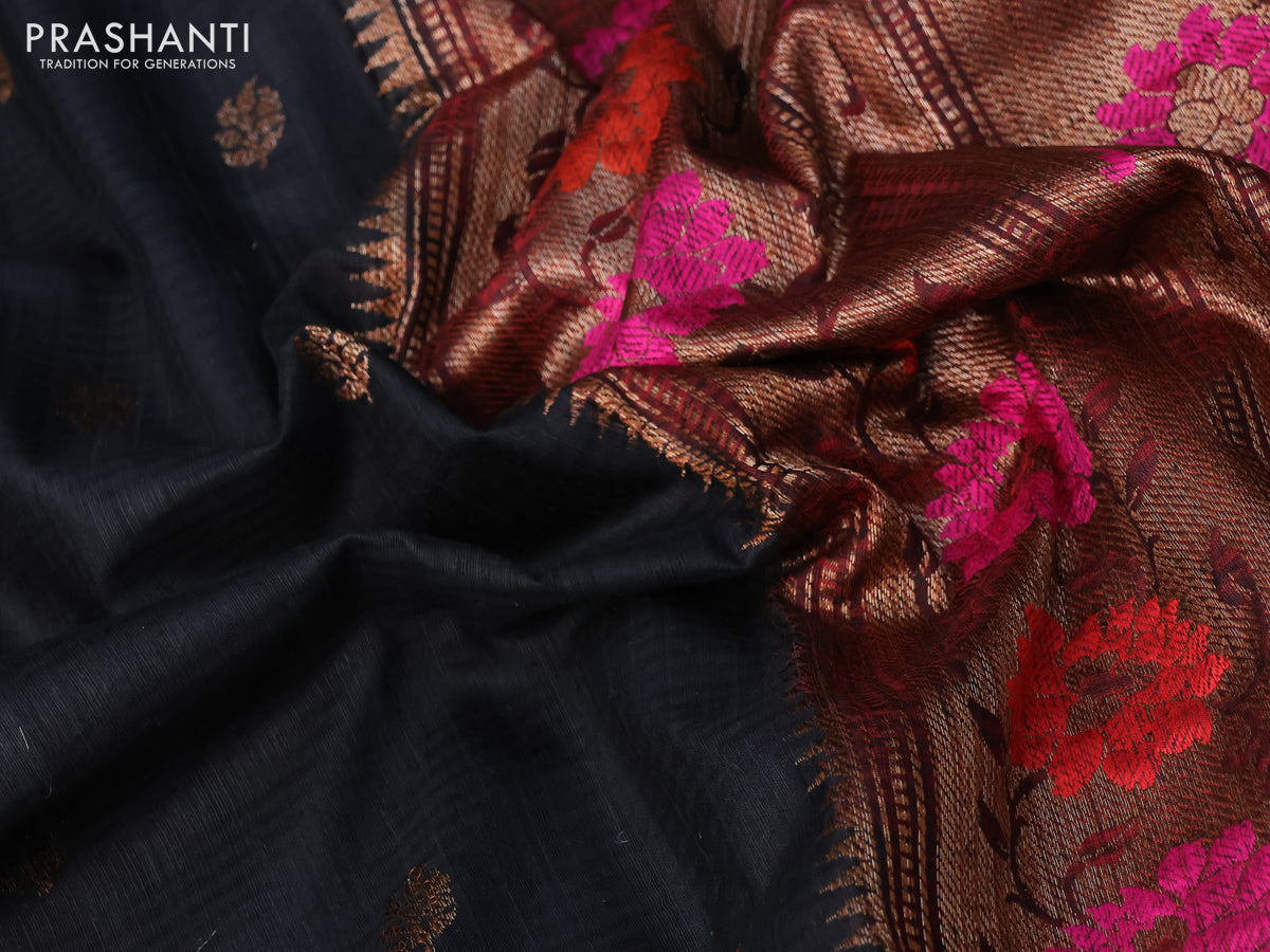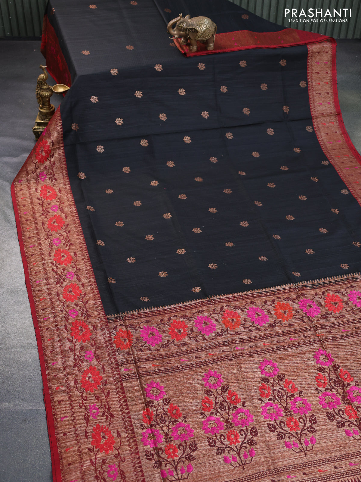 Banarasi dupion silk saree black and red with zari woven buttas and floral design paithani style border