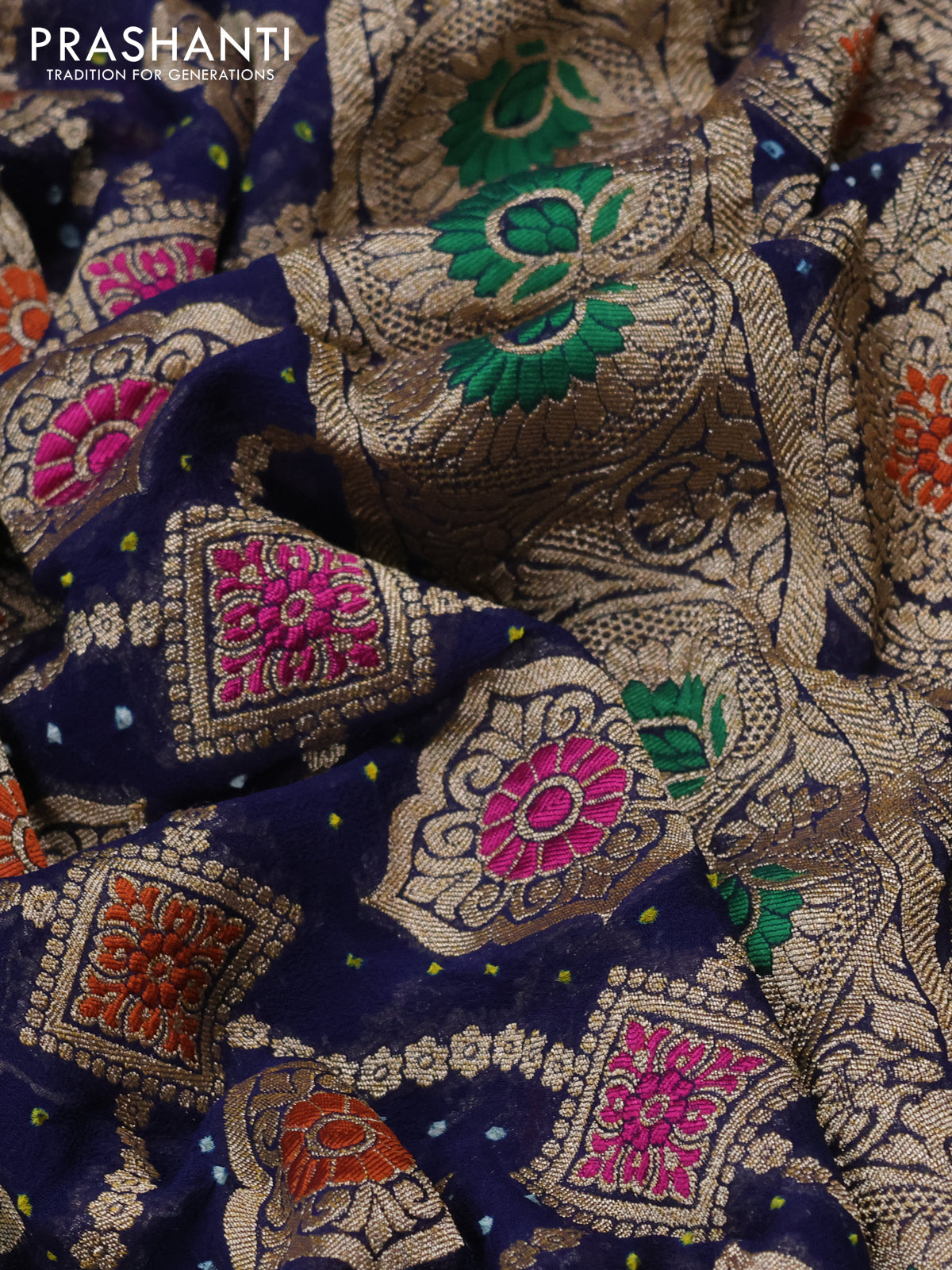 Banarasi georgette saree navy blue with bandhani prints & mina weaves and woven border