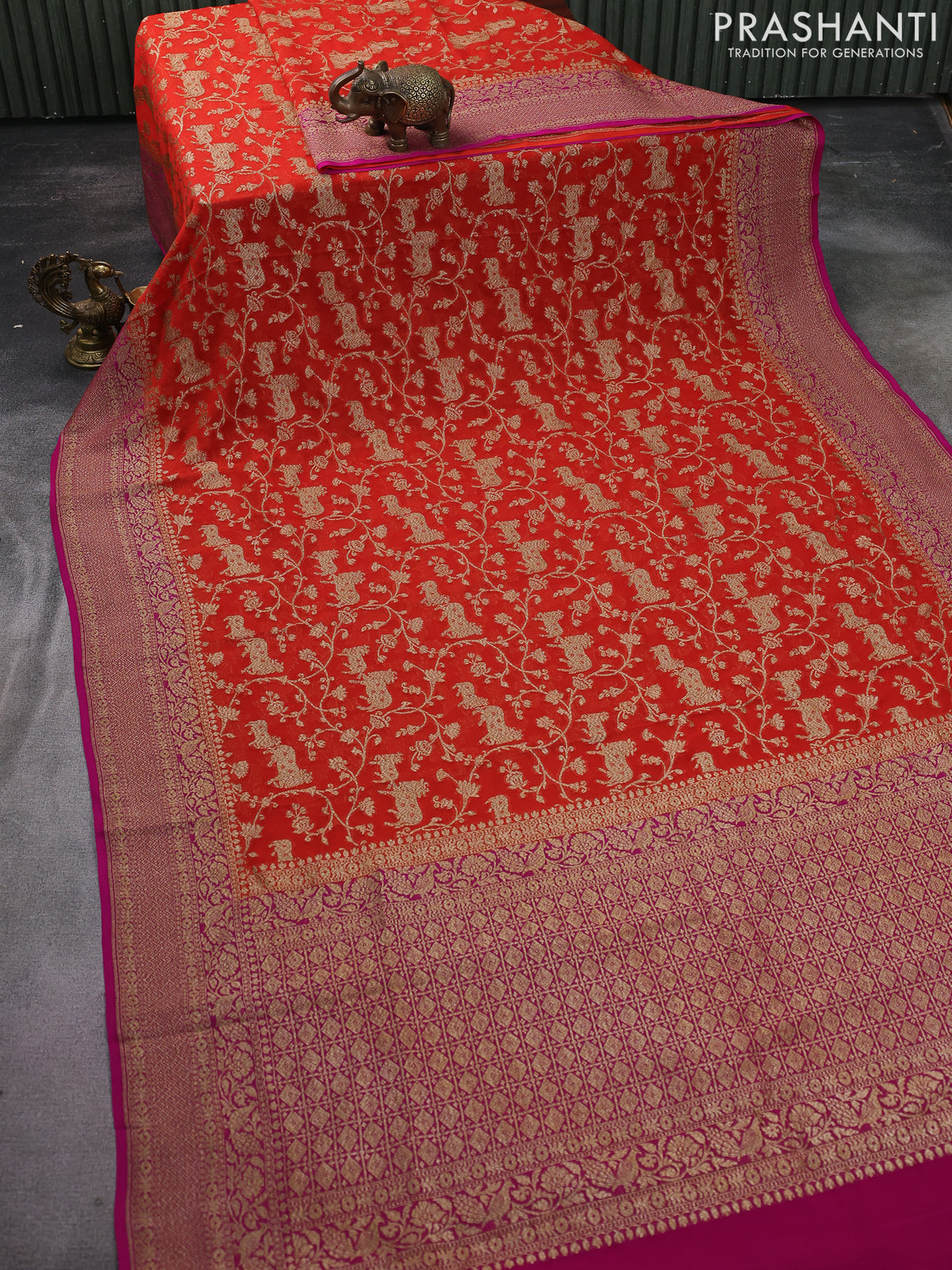 Banarasi georgette saree orange and pink with allover thread & zari pichwai weaves and woven border