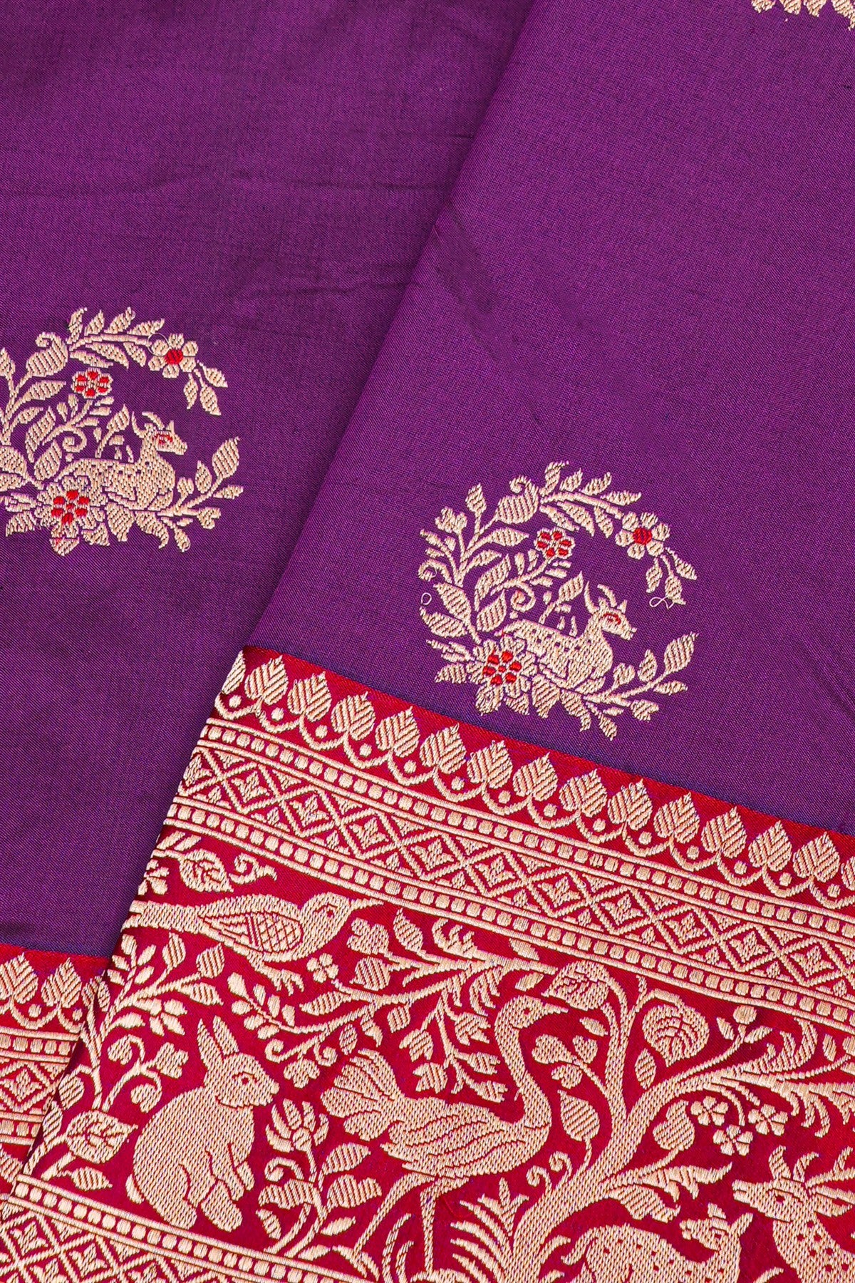 Embrace your spiritual self in this Banarasi Kathan Silk Purple Saree. This goddess inspired saree is tastefully adorned with florals and deers. The contrast border decorated with florals and animals resonates with the essence of culture. The grand brocade pallu and the regal contrast with border blouse puts together an eclectic ensemble.