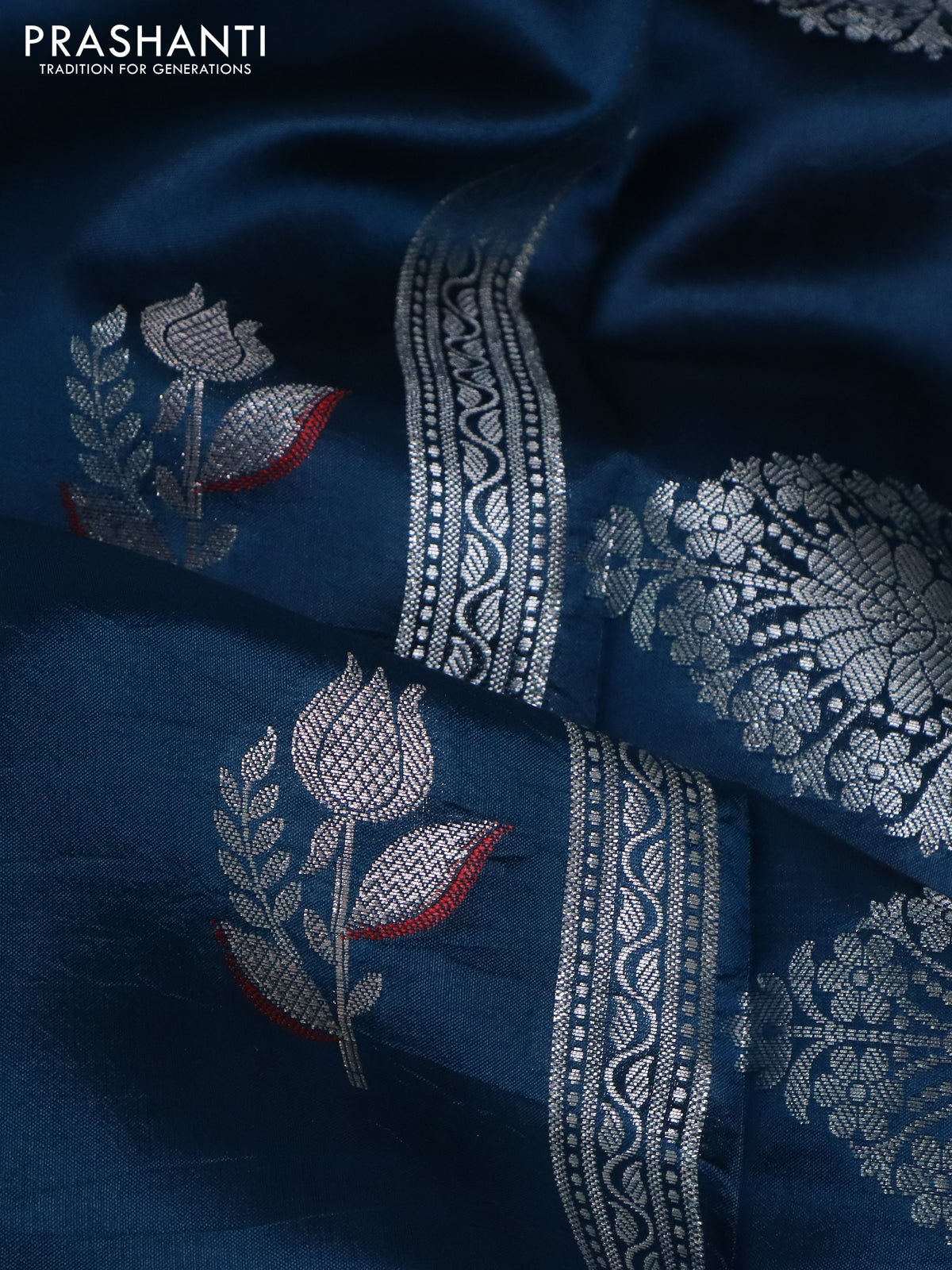 Banarasi poona silk saree cs blue and red with silver zari woven floral buttas and silver zari woven border