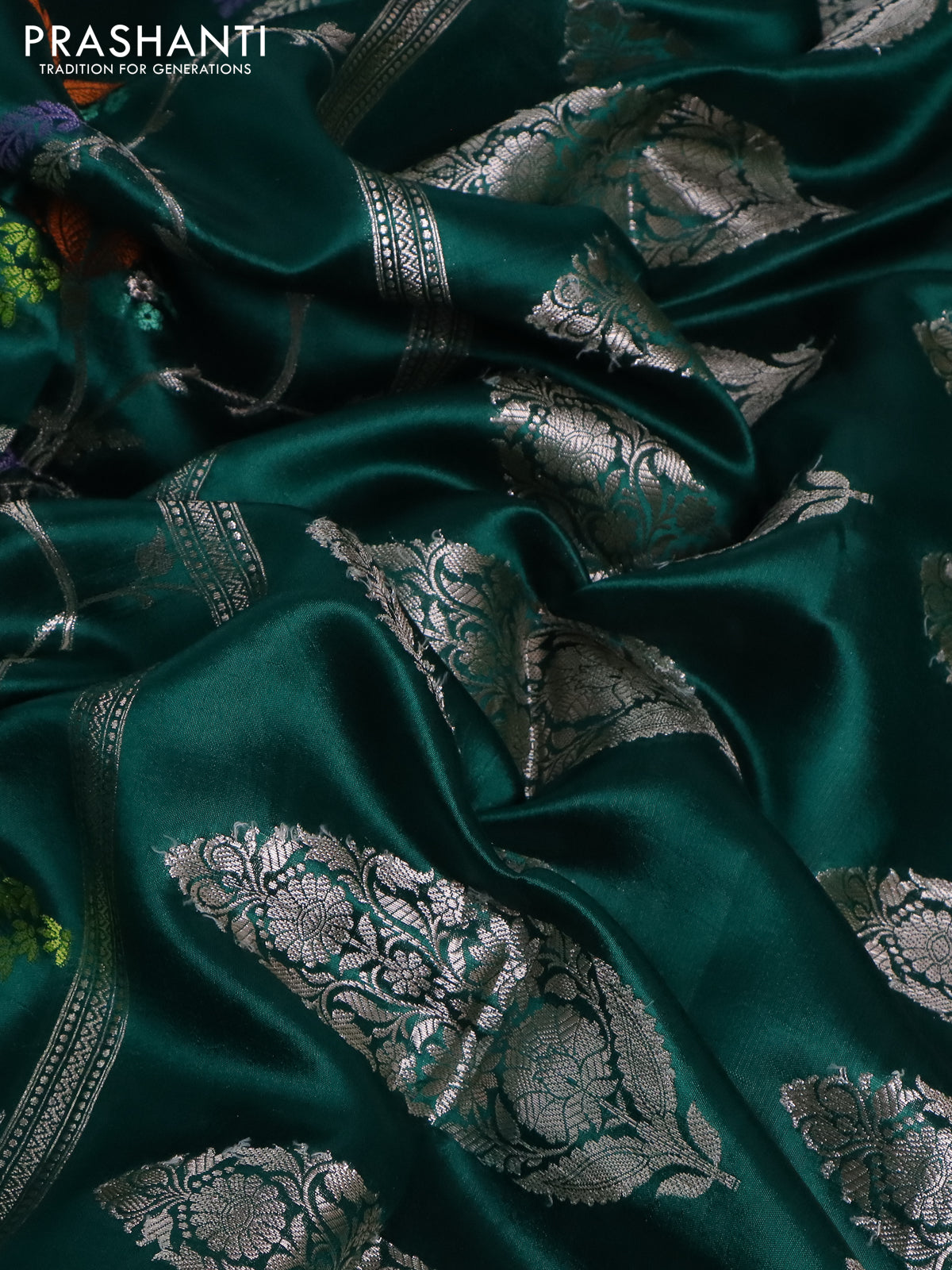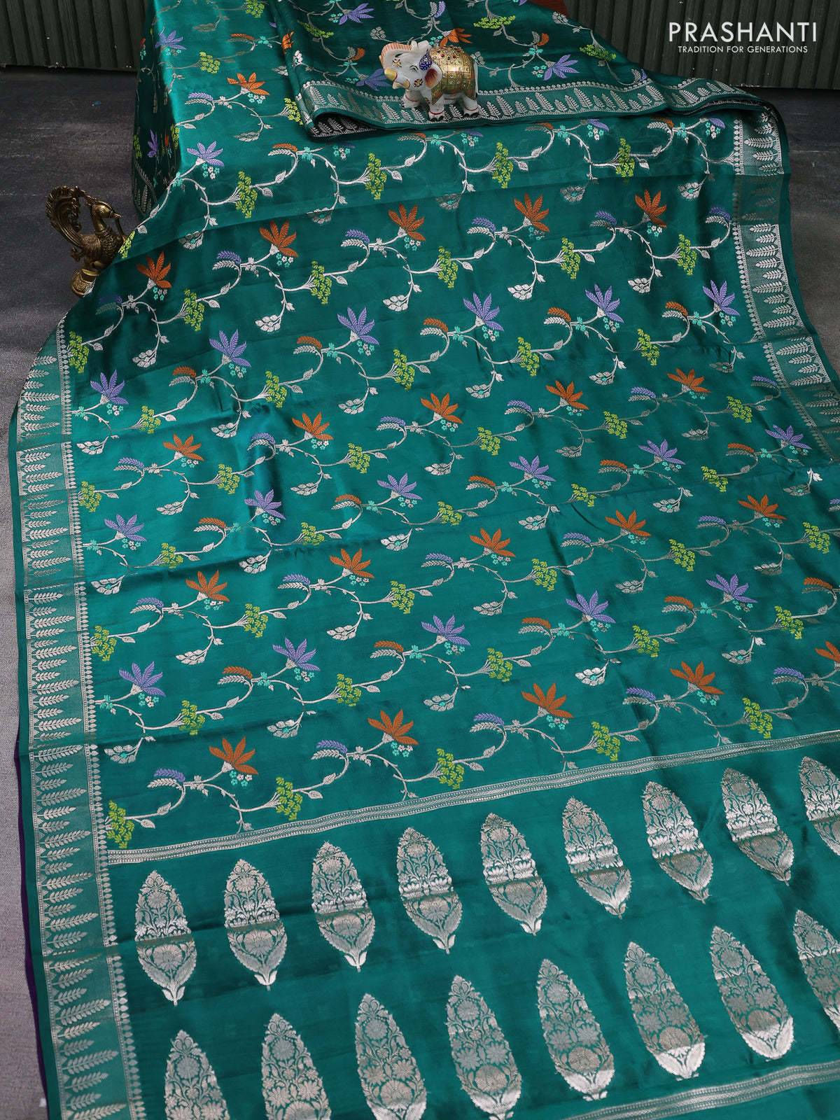 Banarasi poona silk saree teal green and violet with allover thread & silver zari weaves and silver zari woven border