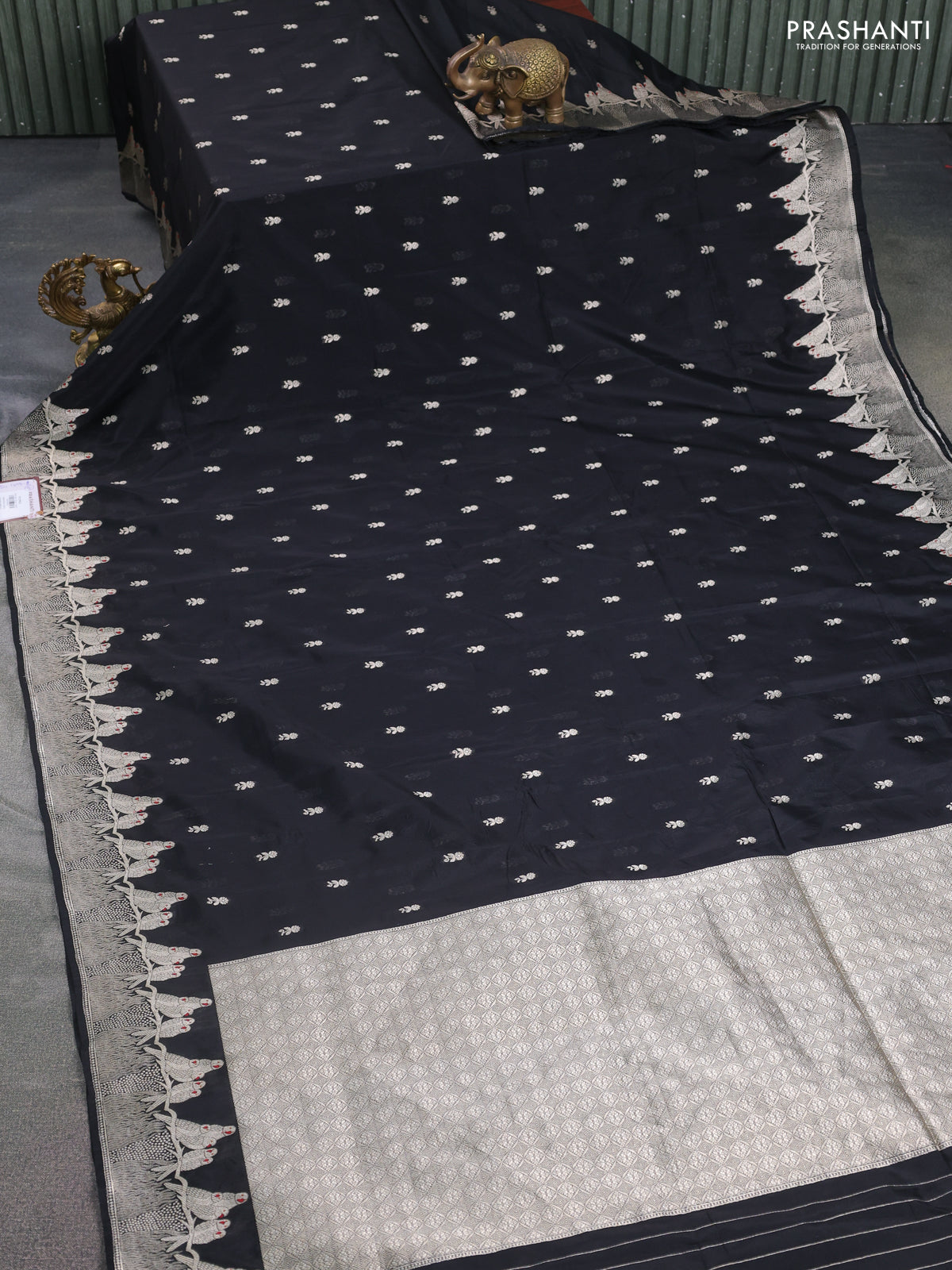 Banarasi semi katan silk saree black with allover zari woven buttas and parrot design zari woven border