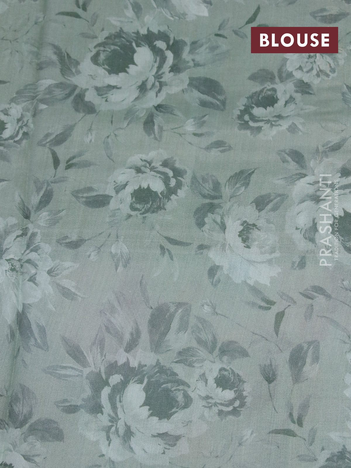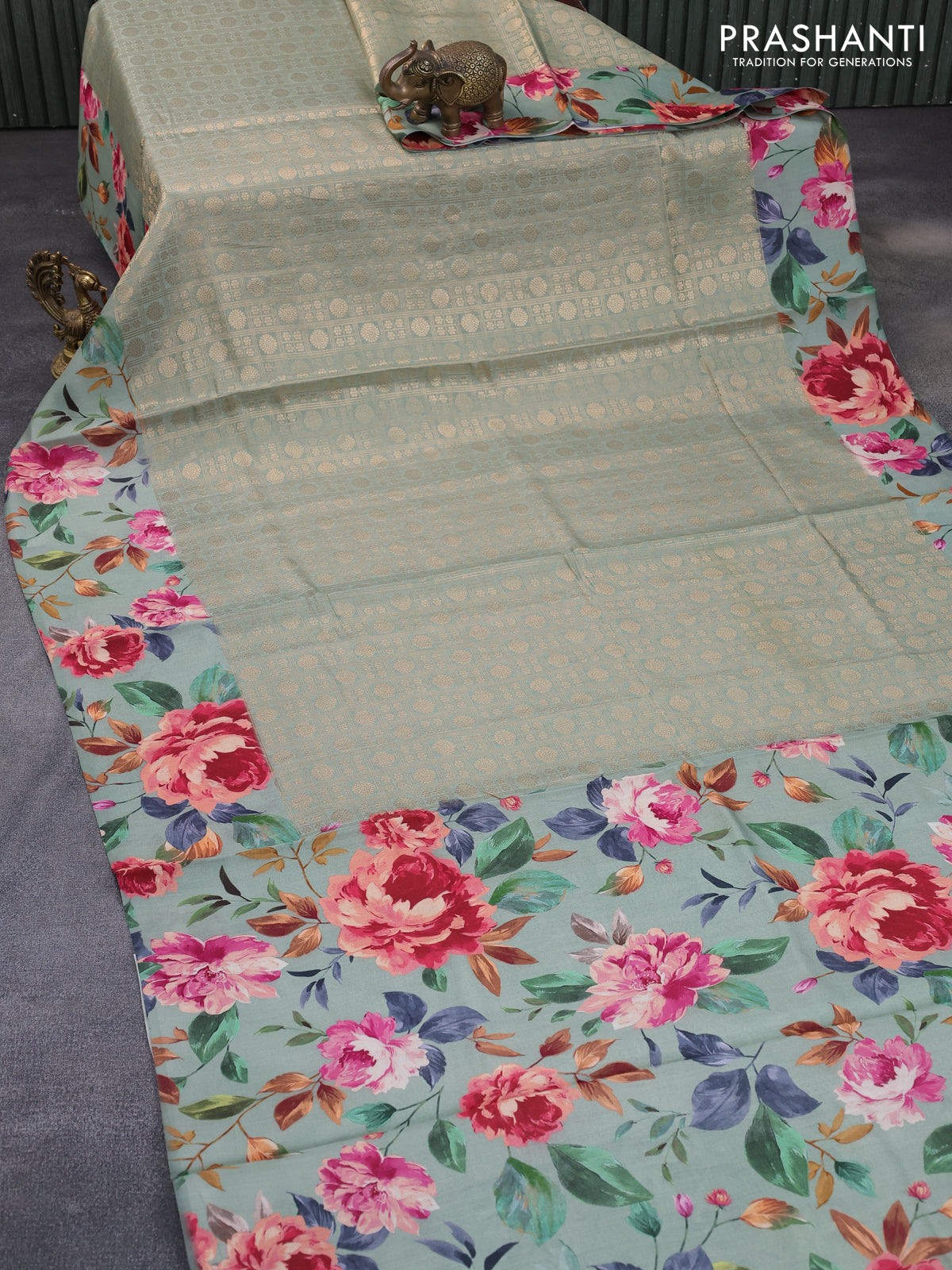 Banarasi silk saree pastel green with allover zari woven brocade weaves and floral digital printed border