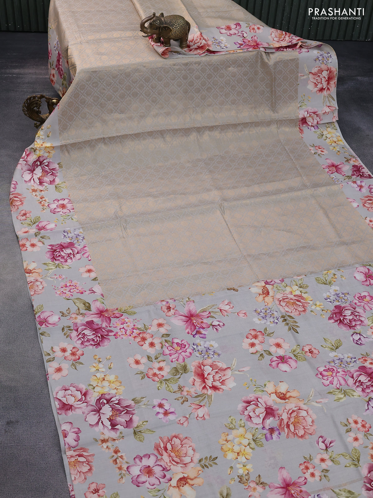 Banarasi silk saree pastel grey with allover zari woven brocade weaves and floral digital printed border