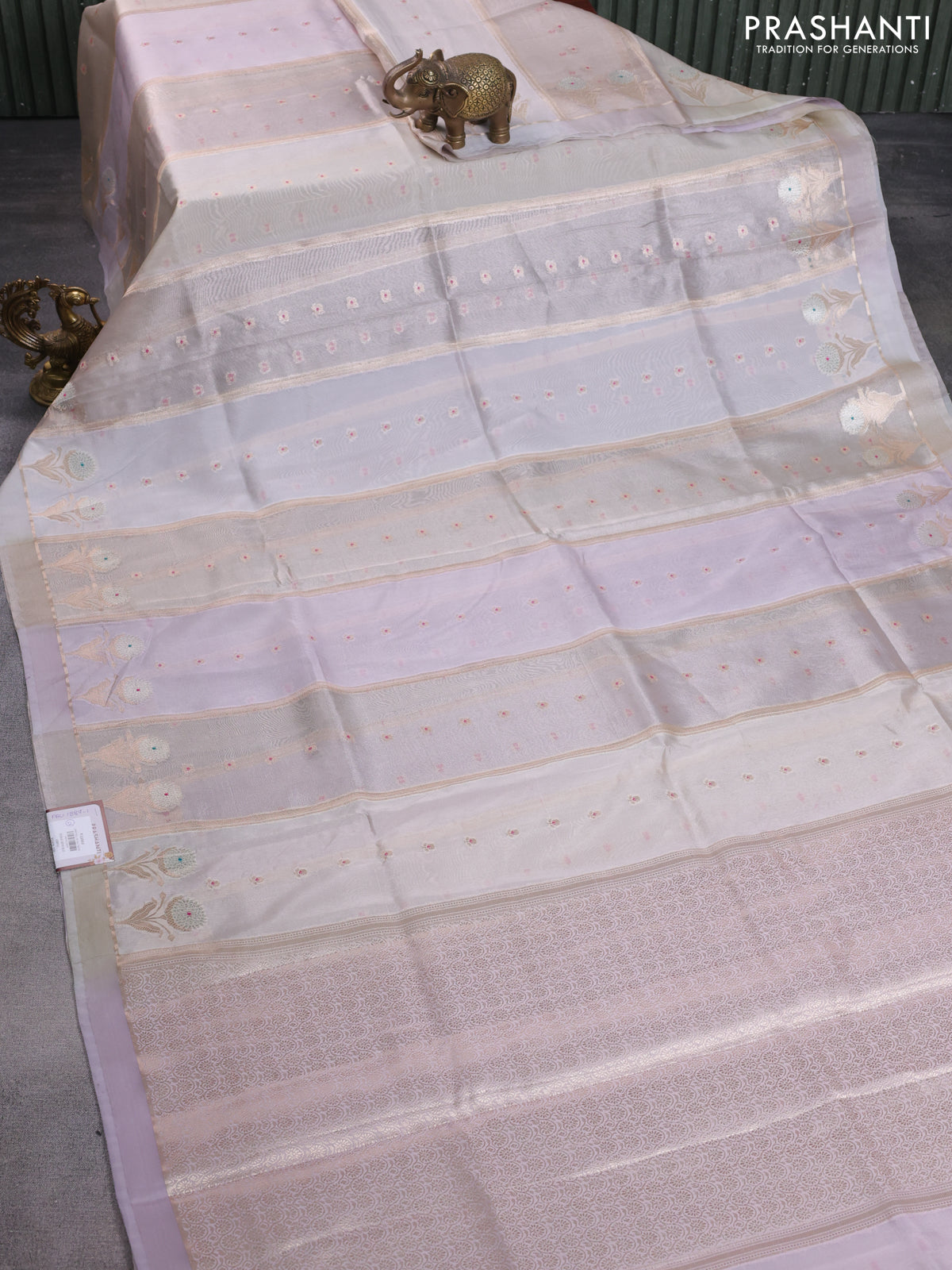 Banarasi tissue semi silk saree beige and pastel lavender with zari weaves & buttas and floral zari woven butta border