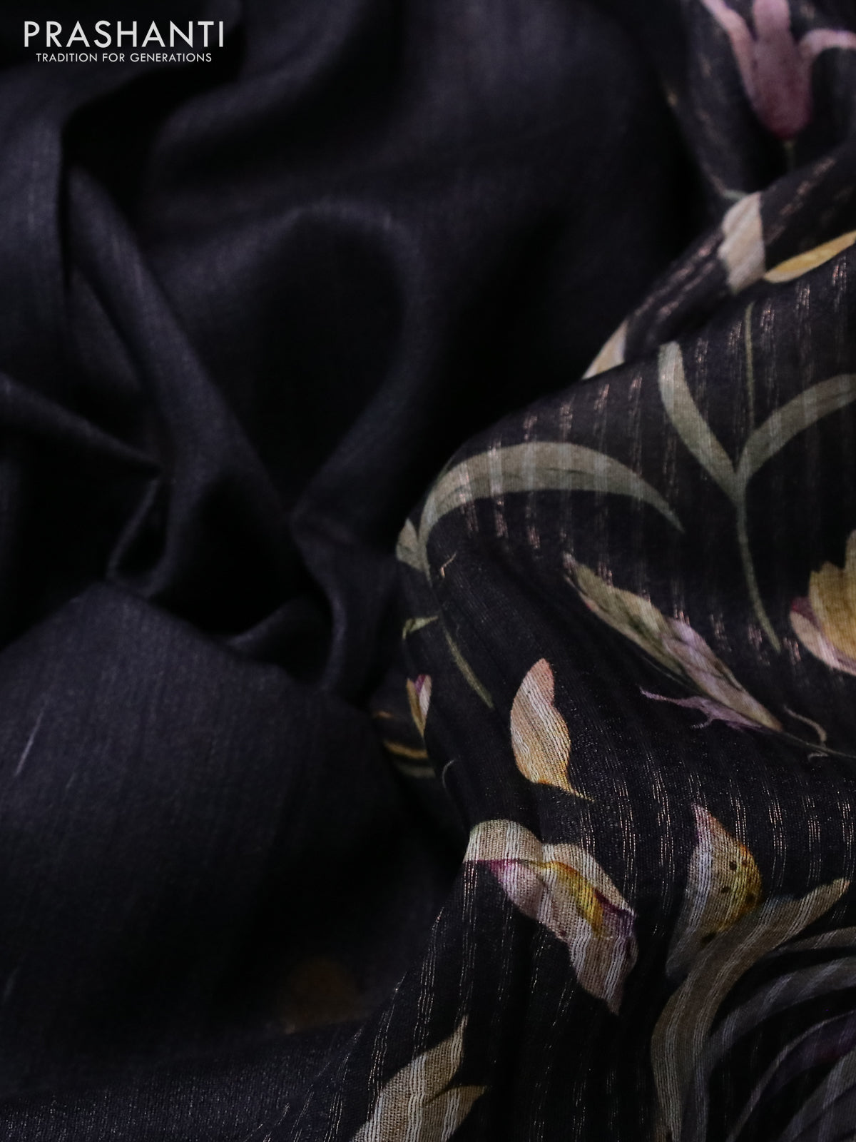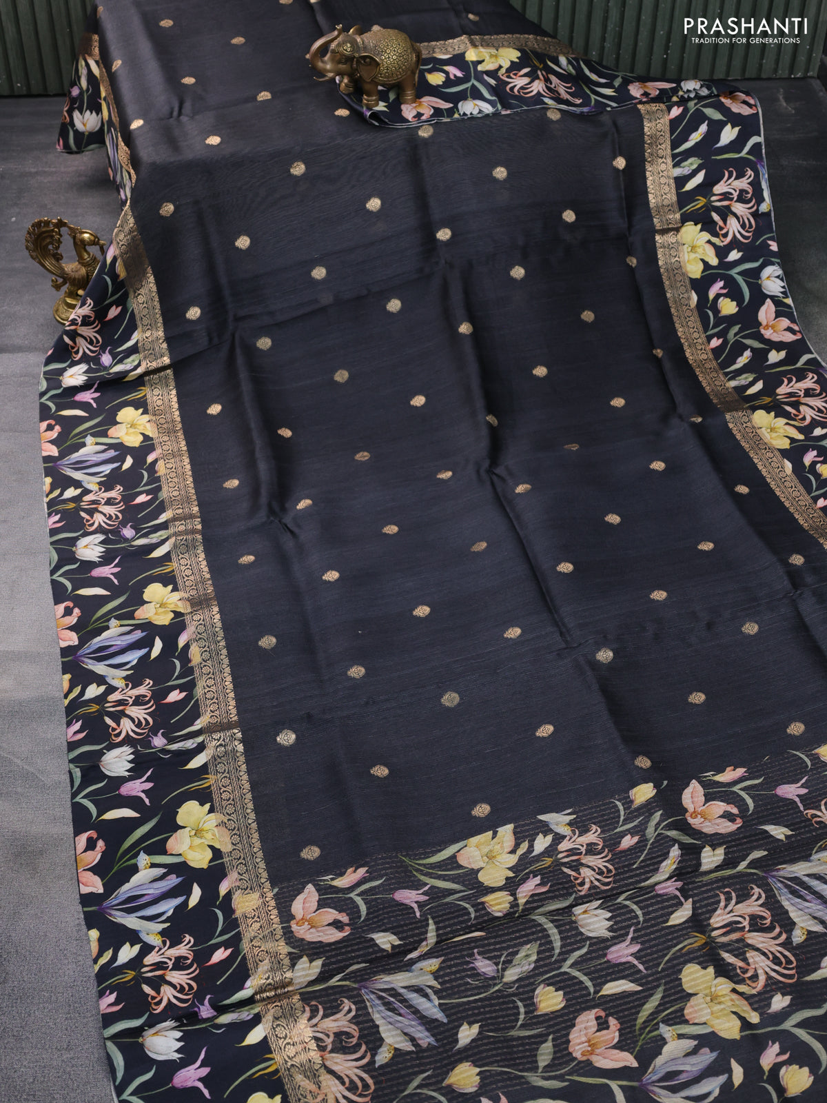 Banarasi tussar silk saree black with zari woven buttas and zari woven floral digital printed border