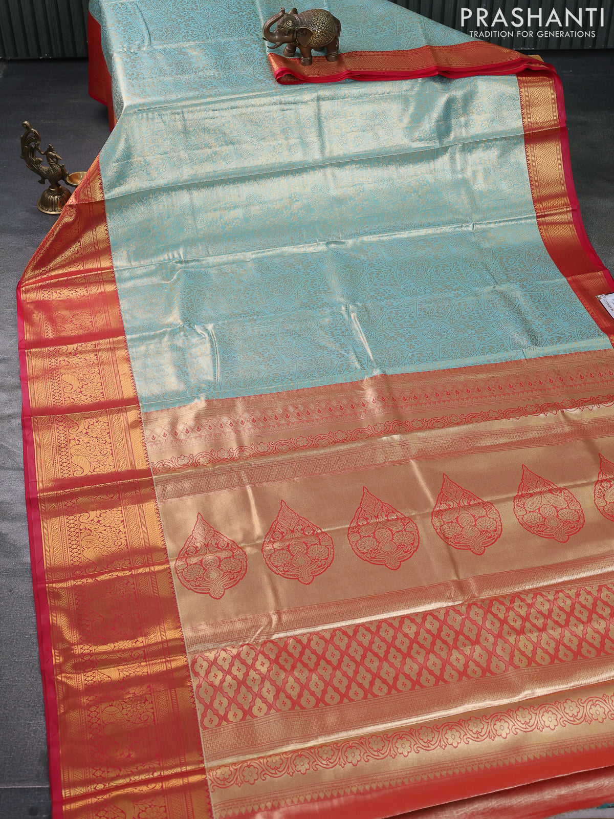 Bangalori tissue silk saree teal blue and reddish pink with allover zari woven brocade weaves and long zari woven border