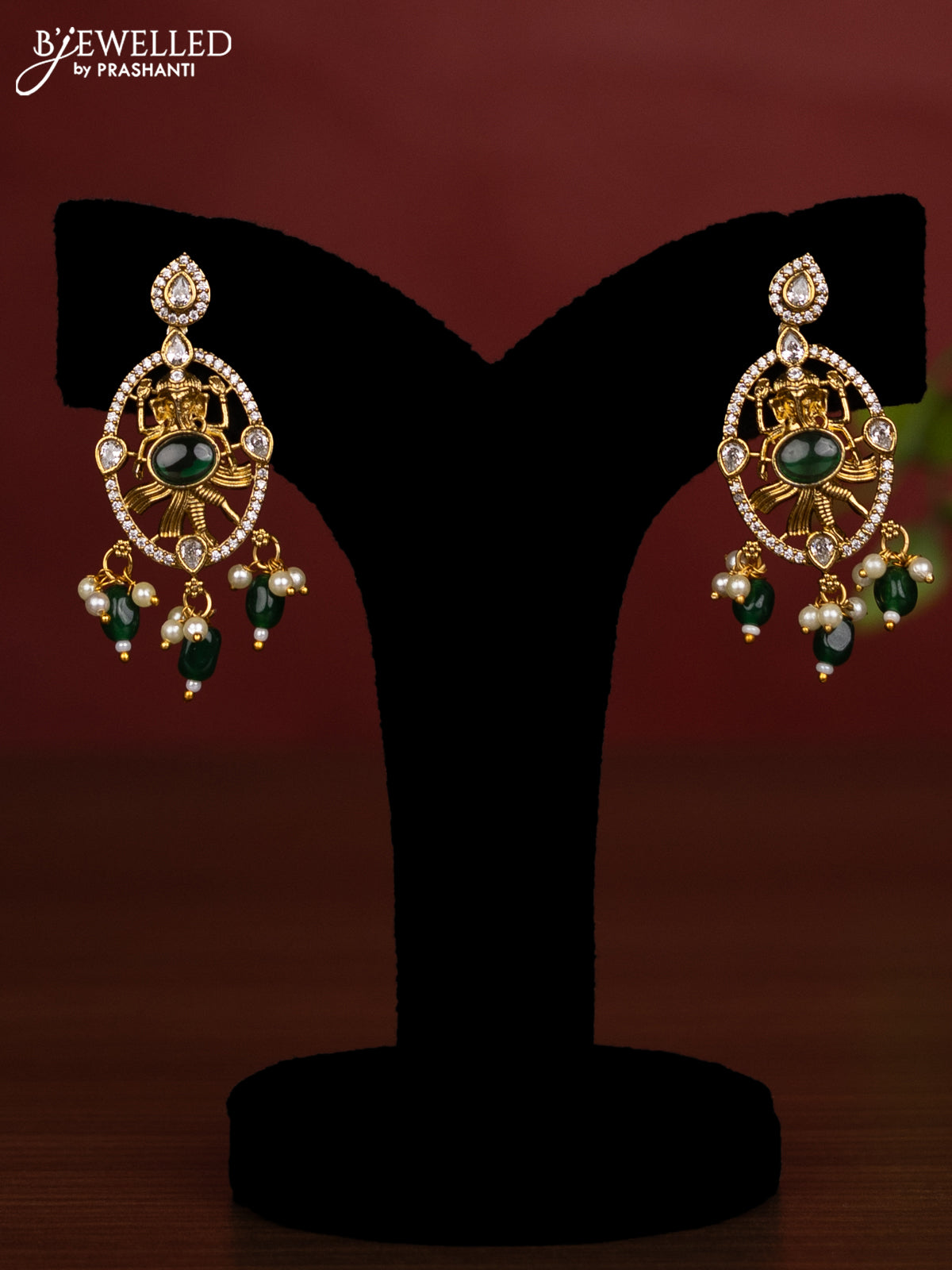 Beaded double layer green necklace ganesha pendant with emerald & cz stones and pearl & beads hanging in victorian finish