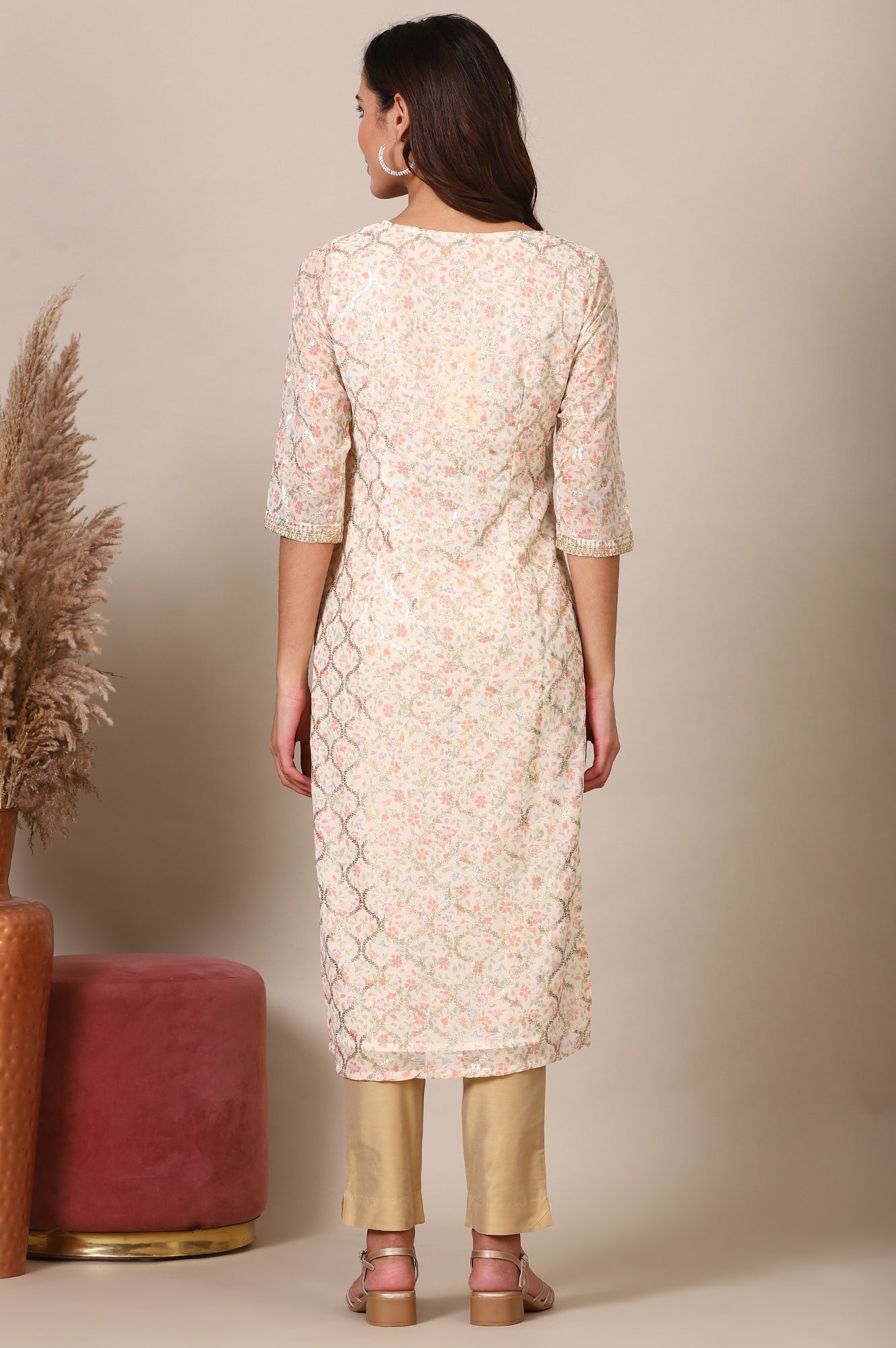 Beige Abstract Printed Georgette Kurta with Embellished Neck