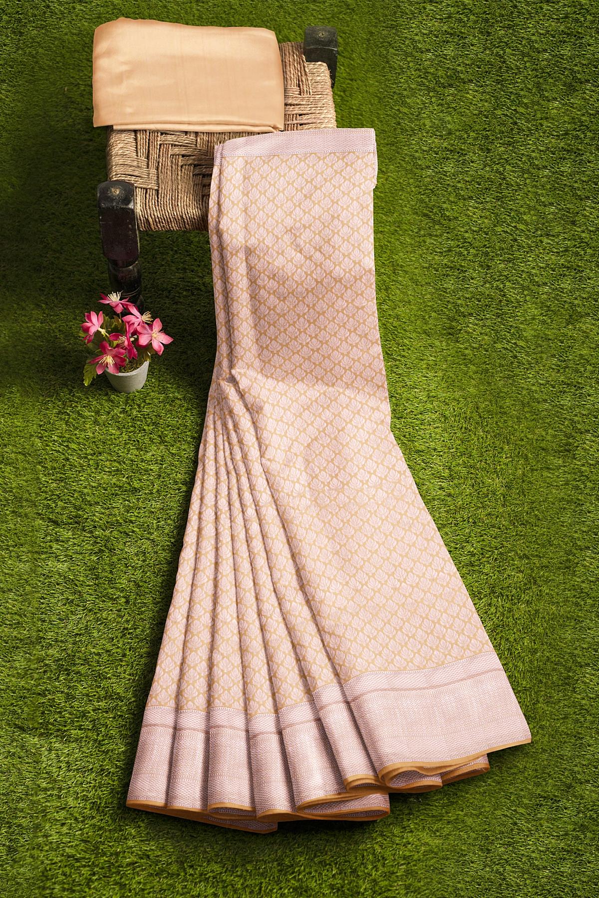 Latest BEIGE FLORALS SILK BLEND Saree with SELF ZARI border. This saree comes with PLAIN WITH BORDER SILK BLEND blouse.