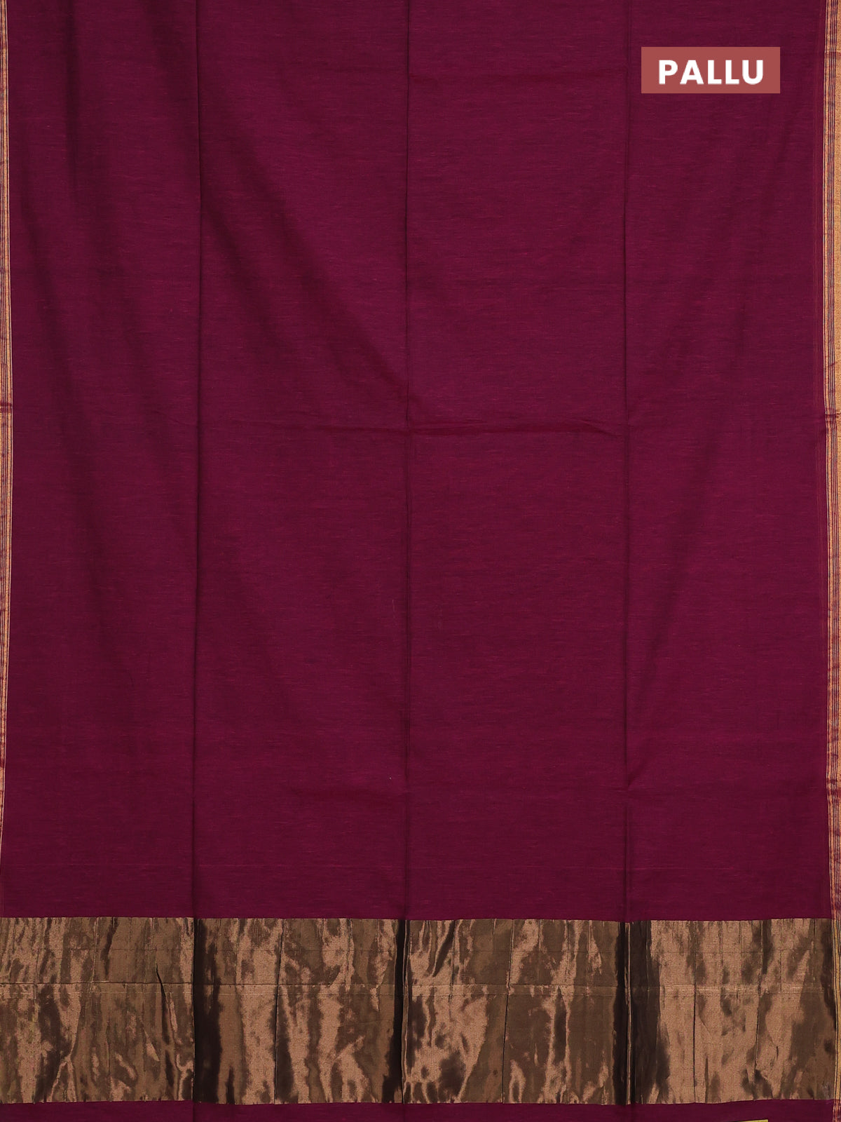 Bengal soft cotton saree dark magenta pink and blue with plain body and zari woven border
