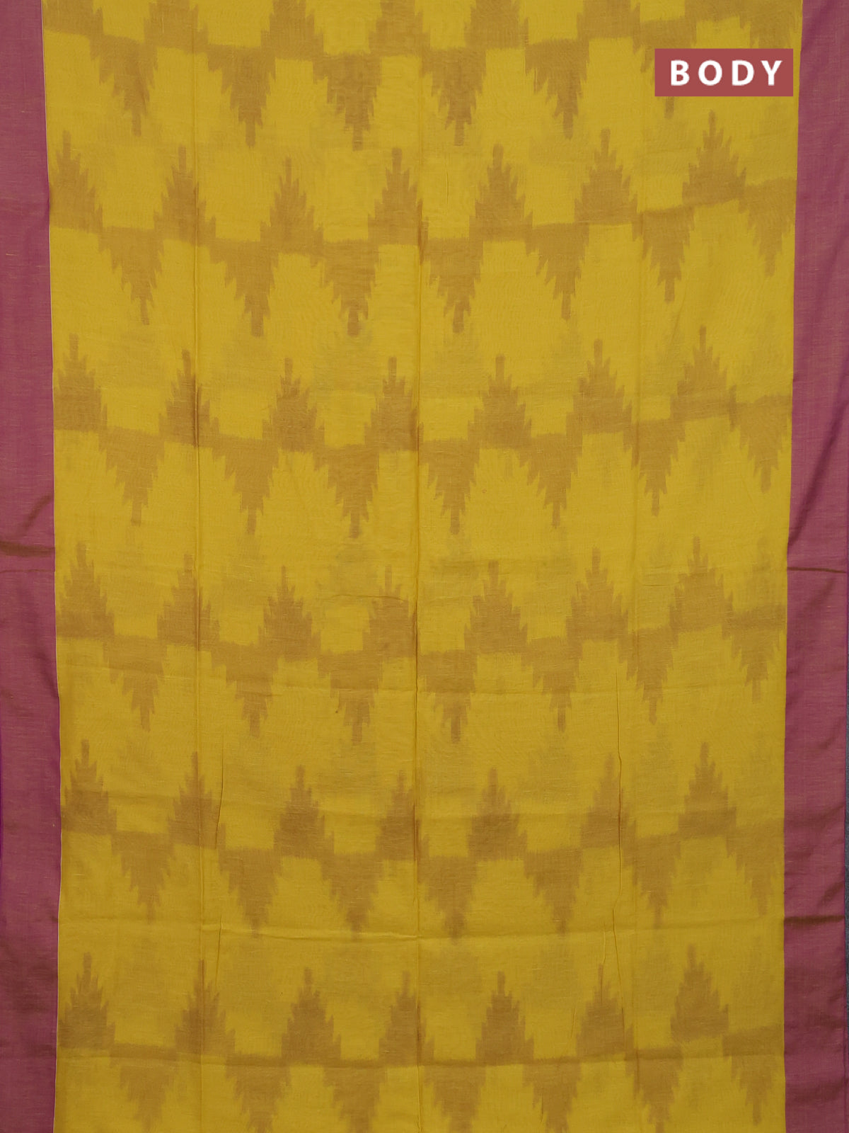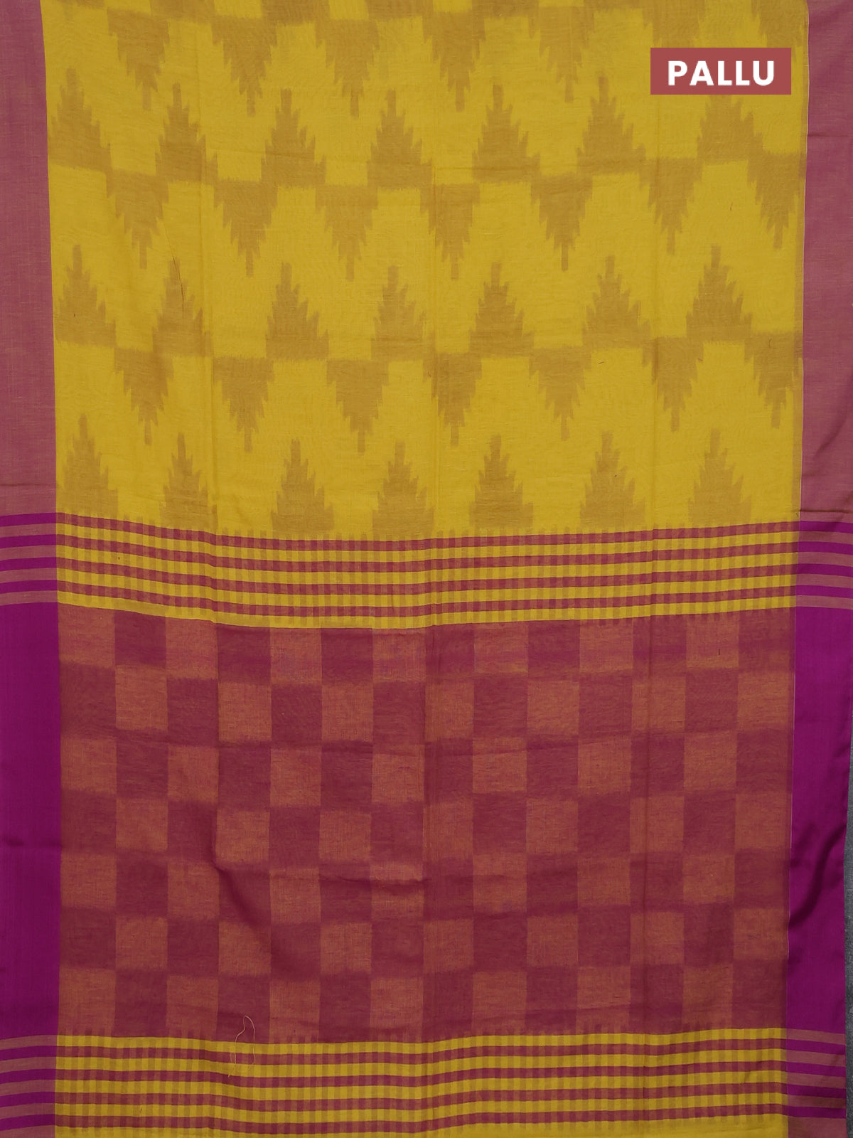 Bengal soft cotton saree yellow and purple with allover geometric weaves and simple border