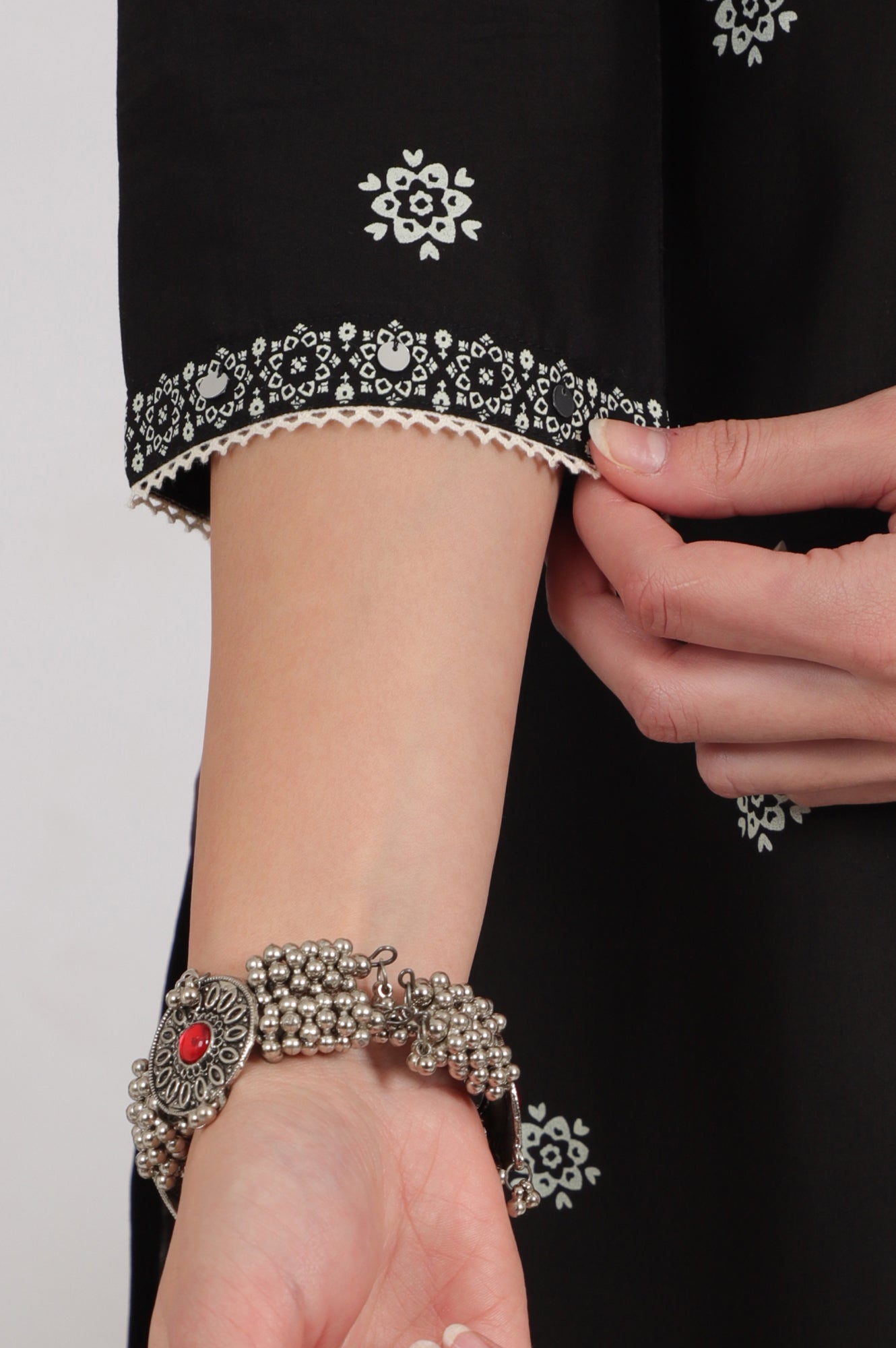 A timeless classic, this black straight kurta features traditional Bandhani prints over breathable pure cotton. The straight silhouette lends a clean, tailored look while offering all-day comfort. The Bandhani pattern brings cultural richness, perfectly suited for festive gatherings or semi-formal events. The round neckline and three-quarter sleeves balance tradition with functionality. Crafted from soft, natural cotton, this kurta ensures excellent breathability, especially in warmer climates. Its minimal yet striking appeal makes it a versatile piece in your ethnic wardrobe. Wear it solo or layer it under a dupatta for a more styled look. This kurta for women is a refined addition to your festive rotation, with a design that celebrates heritage through a modern lens.