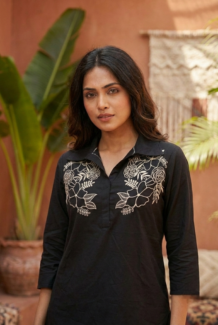 Black Cotton Floral Hand Embroidery Coord Set Elevate your ethnic wardrobe with this stunning coord set, thoughtfully crafted from soft cotton fabric. Each piece features intricate hand embroidery with delicate floral motifs, showcasing traditional artistry and attention to detail. The coordinated top and bottom design makes styling effortless while maintaining an elegant, put-together look. Perfect for festive occasions, casual gatherings, or whenever you want to celebrate your cultural heritage with confidence. Comfortable, versatile, and beautifully made—this set is a wonderful addition to any collection.