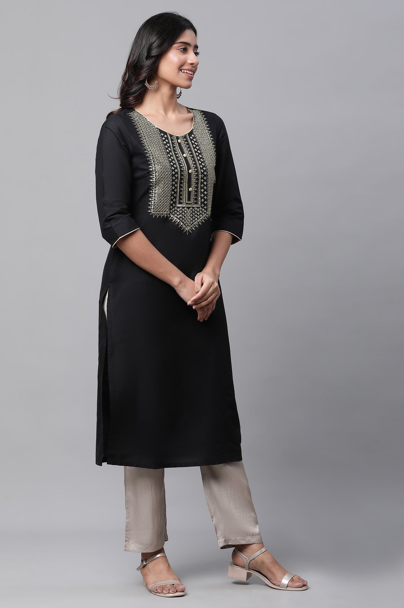 Elegance redefined! This black kurta for women is a perfect blend of tradition and style, featuring intricate zari embroidery in golden hues. The round neckline is adorned with golden piping, adding a touch of sophistication. Crafted in woven fabric, this straight silhouette kurta is designed for festive occasions. The calf-length hemline and 3/4 sleeves make it versatile and comfortable. Pair it with golden palazzos and a matching dupatta to complete your festive look.