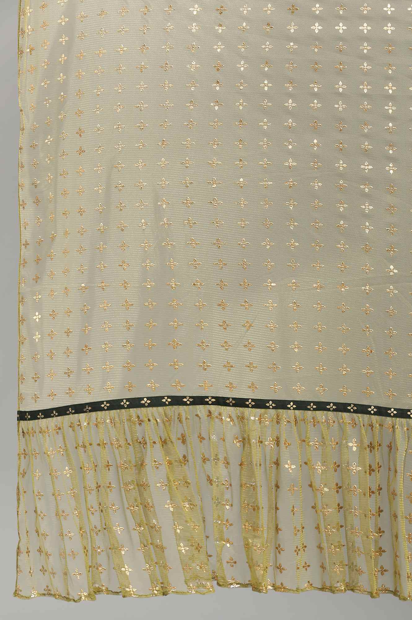 This ethnic set has a black round neck 3/4 sleeve crop top with printed and mirror detail, a black flared skirt with printed, embellished and mirror detail and a green embellished dupatta.