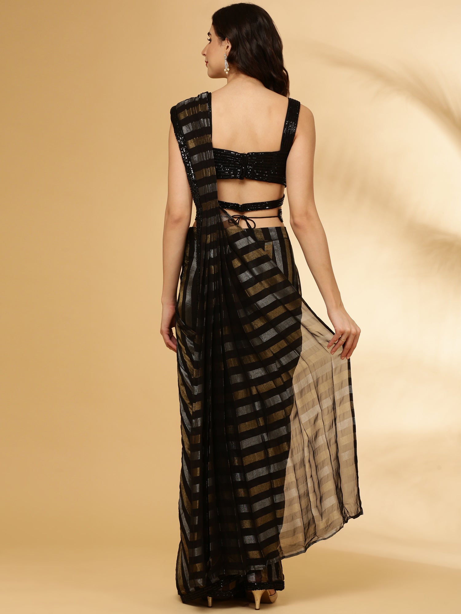 Crafted from delicate tissue fabric, this black saree exudes elegance and grace. The accompanying belt enhances your silhouette, offering a modern touch to a timeless drape. Perfect for formal occasions, it blends tradition with a sleek, sophisticated style.