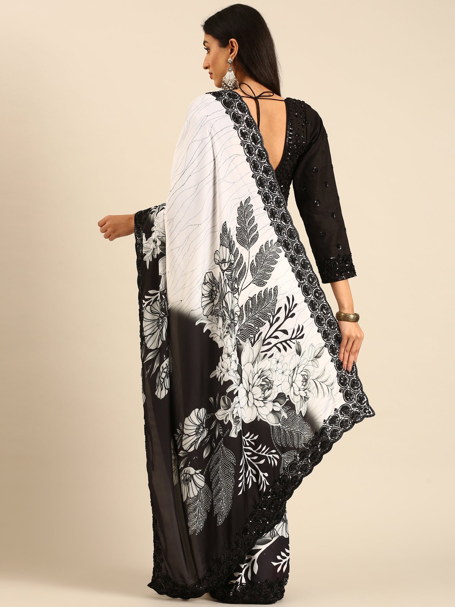 Black & white satin printed saree with hand embroidery & ready made blouse