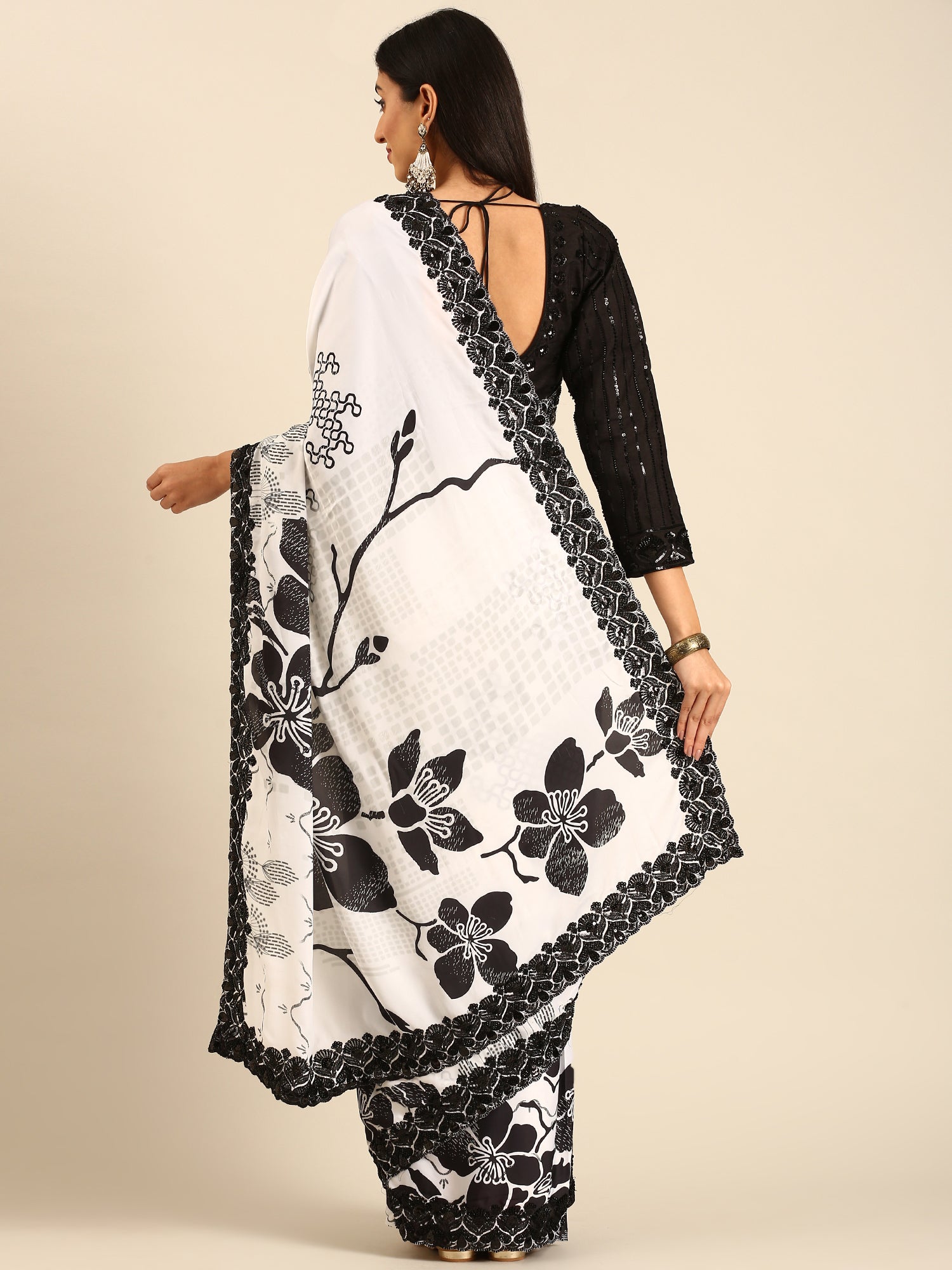 Black & white satin printed saree with hand embroidery & ready made blouse