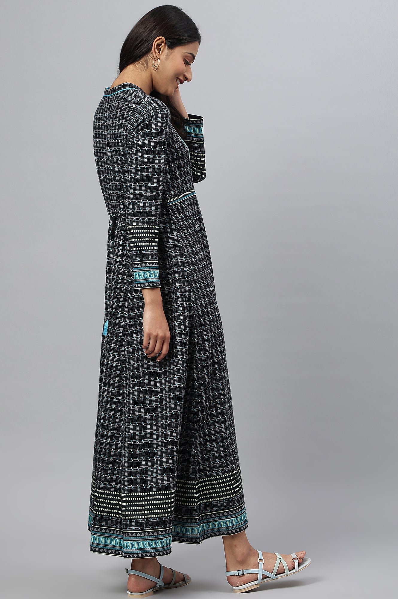 Keep yourself warm and comfortable by putting on this floor length dress. It features a fine geometric design on the yoke, a mandarin collar and full length placement sleeves.