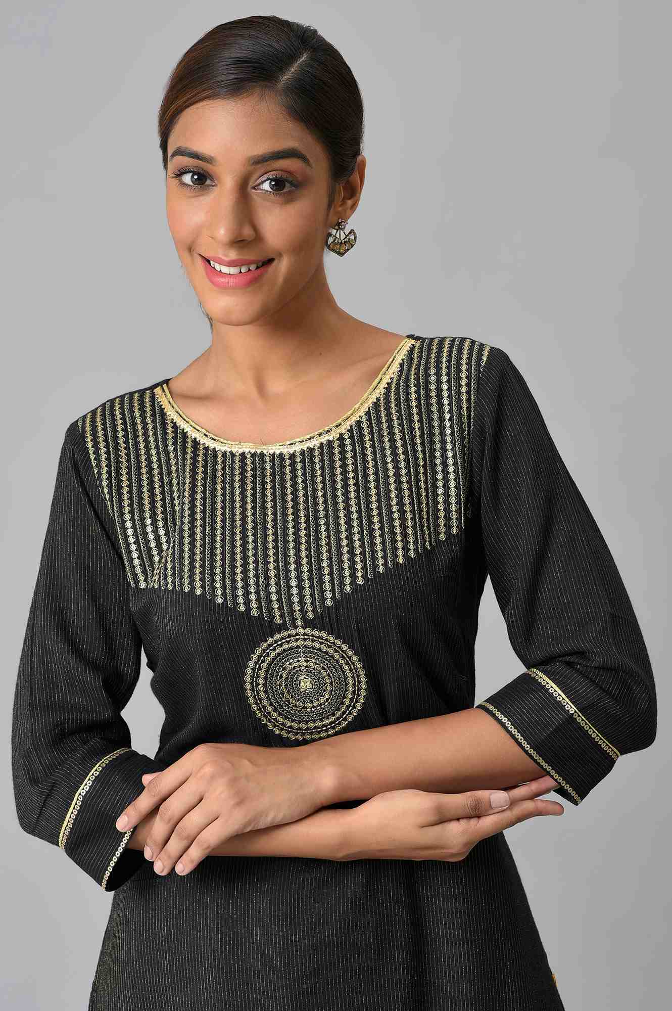 Elegance meets richness in this black viscose blend kurta and palazzo set featuring intricate zari embroidery and sequins. The straight kurta flatters all body types while the palazzos offer a flowy counterpart. Designed for festive evenings or celebratory dinners, the ensemble is perfect for those who prefer refined opulence with comfort.