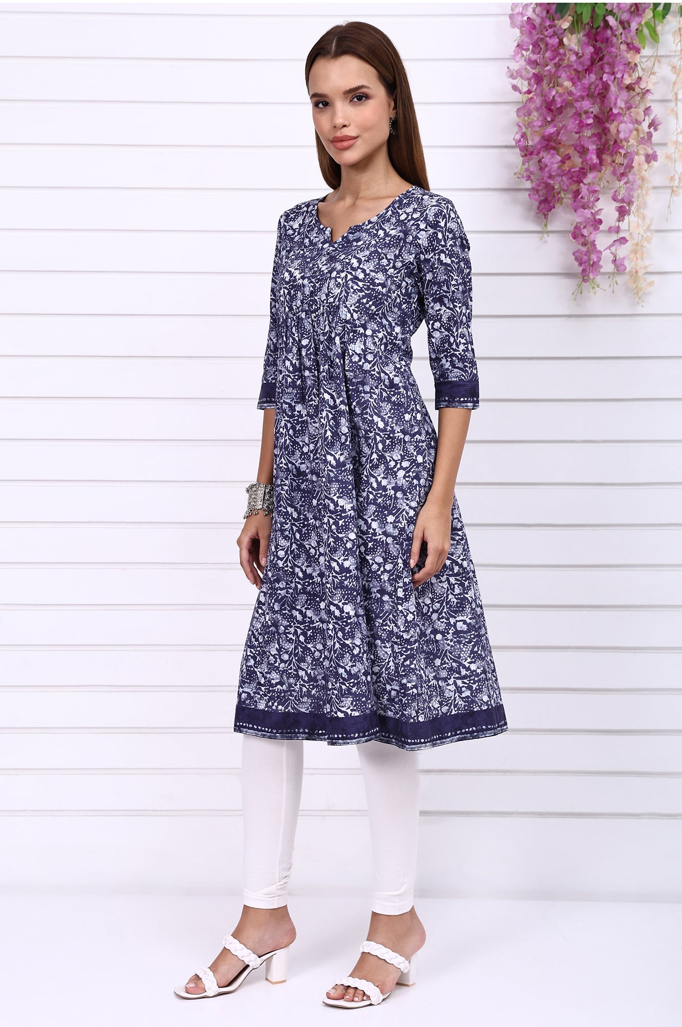 Channel artistic roots with this blue batik printed flared kurta, designed for comfort and visual impact. The all-over batik pattern, rendered in rich blue hues, adds handcrafted charm, while the breathable cotton fabric ensures all-day wearability. The flared silhouette and soft gathers make it a flattering choice for many body types, while the round neckline and 3/4th sleeves keep the look balanced. This blue batik print casual cotton kurta is a go-to option for both workday cool and off-duty charm.
