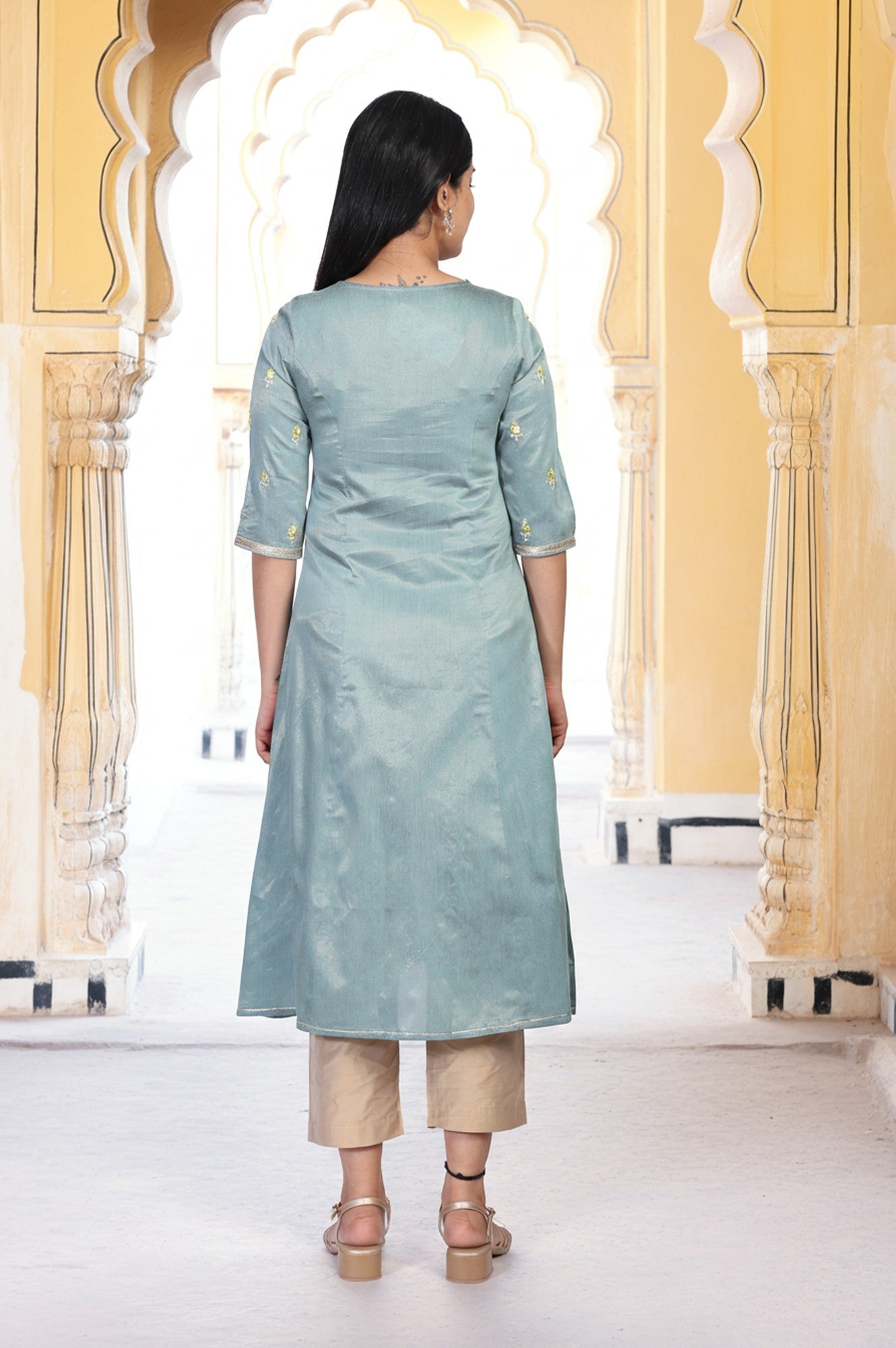 A vision of serene elegance, this beautiful kurta for women is rendered in a calming Seafoam Haze hue, reminiscent of tranquil waters. It’s an apparel piece that speaks volumes with its understated grace. The A-line silhouette flows gracefully from the shoulders, offering both sublime comfort and a universally flattering shape that suits any occasion. Its round neckline is beautifully detailed with intricate floral embroidery in contrasting tones, which extends down the yoke to create a captivating focal point. The three-quarter sleeves are thoughtfully designed, ending in a delicate sequined border that adds a subtle touch of festive shimmer to this lovely ethnic wear. Crafted from a comfortable, yarn-dyed fabric, this A-line kurti has a unique self-texture and is fully opaque for confident wear, ensuring no transparency issues. The straight hemline is finished with practical side slits, allowing for ease of movement throughout your day. Whether you're attending a daytime celebration or a semi-formal gathering, this embroidered kurta effortlessly blends traditional artistry with contemporary style. You’ll find this stunning tunic becomes a cherished and versatile piece in your wardrobe, perfect for creating memorable looks.