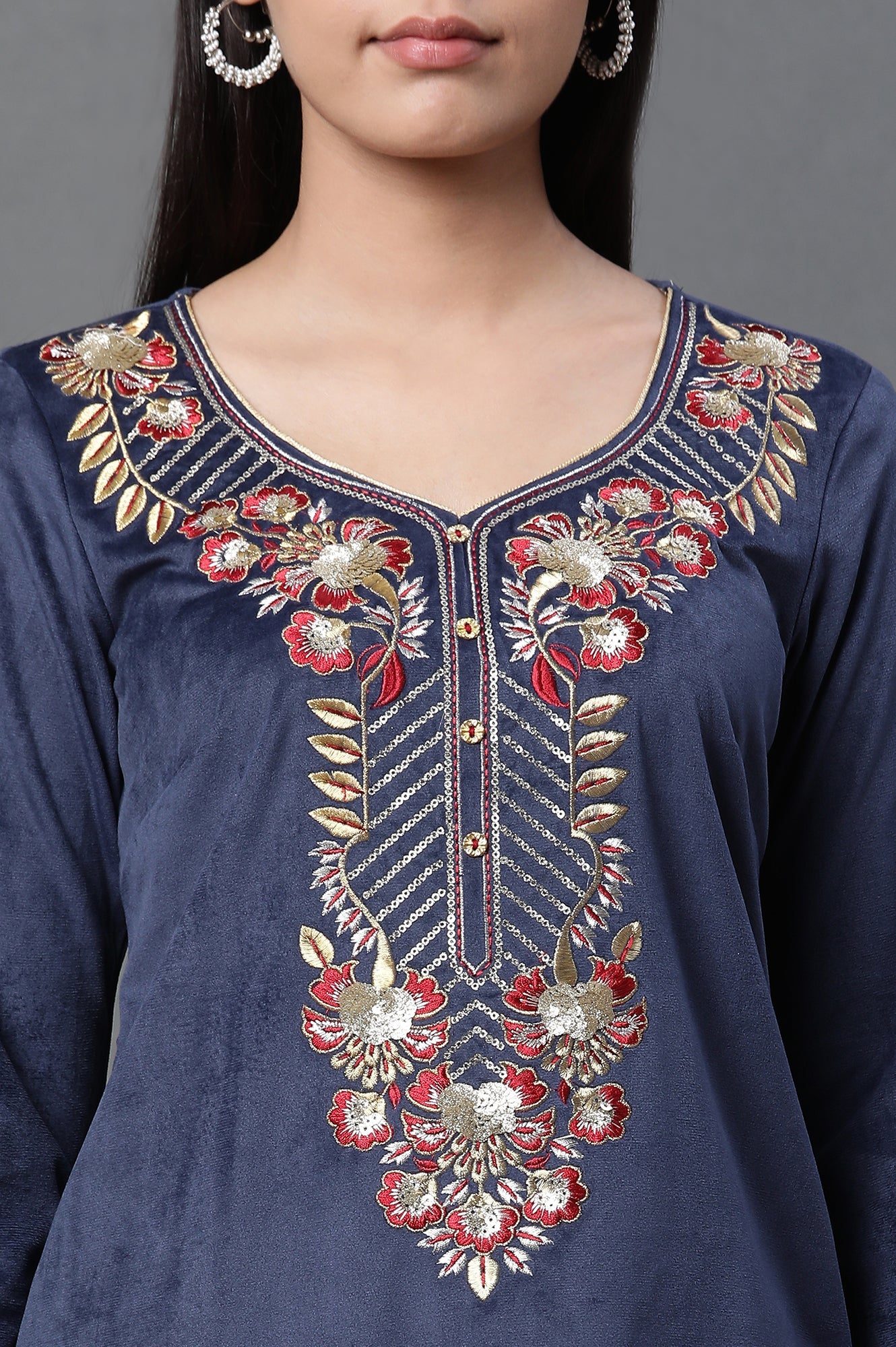 Here is what you need this winter designed to make a statement at weddings and festive occasions. The kurta features intricate heavy embroidery on the yoke, beautifully enhanced with button details, adding a touch of sophistication. Paired with our tonal velvet slim pants, this set offers a coordinated and stylish ensemble.