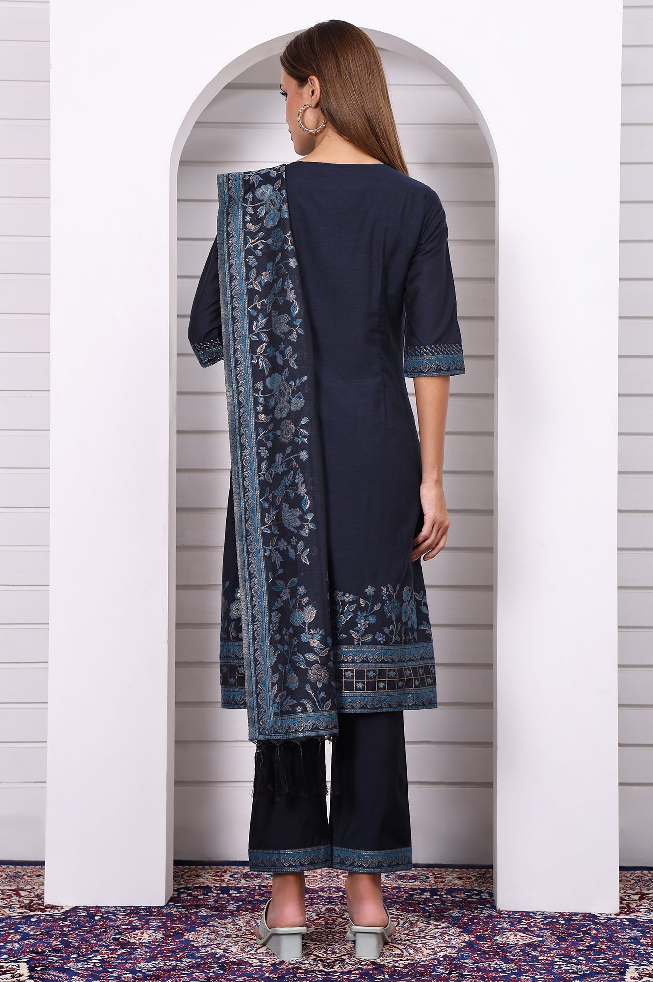 Blue Ethnic Motifs Printed Hand Work Jacquard Straight Kurta, Palazzo and Dupatta Set