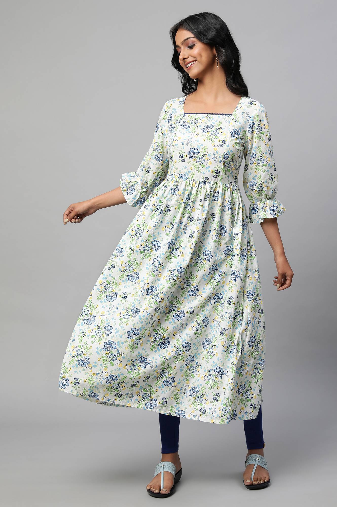 Romanticize this summer with elegant and stylish Aurelia kurta sets. This set includes blue floral print kurta which is designed in flared silhouette and has square neck. It is paired with blue tights.