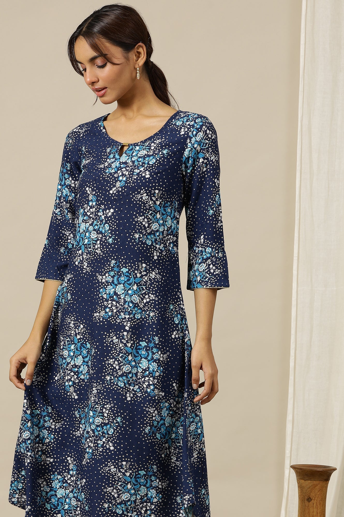 Indulge in the charm of our dark blue floral printed kurta. The round neckline features a stylish V-slit, adorned with metal clasp detailing. Effortlessly combining elegance in A-line flare with rounded hemline, this kurta is a timeless addition to your wardrobe, perfect for any occasion.