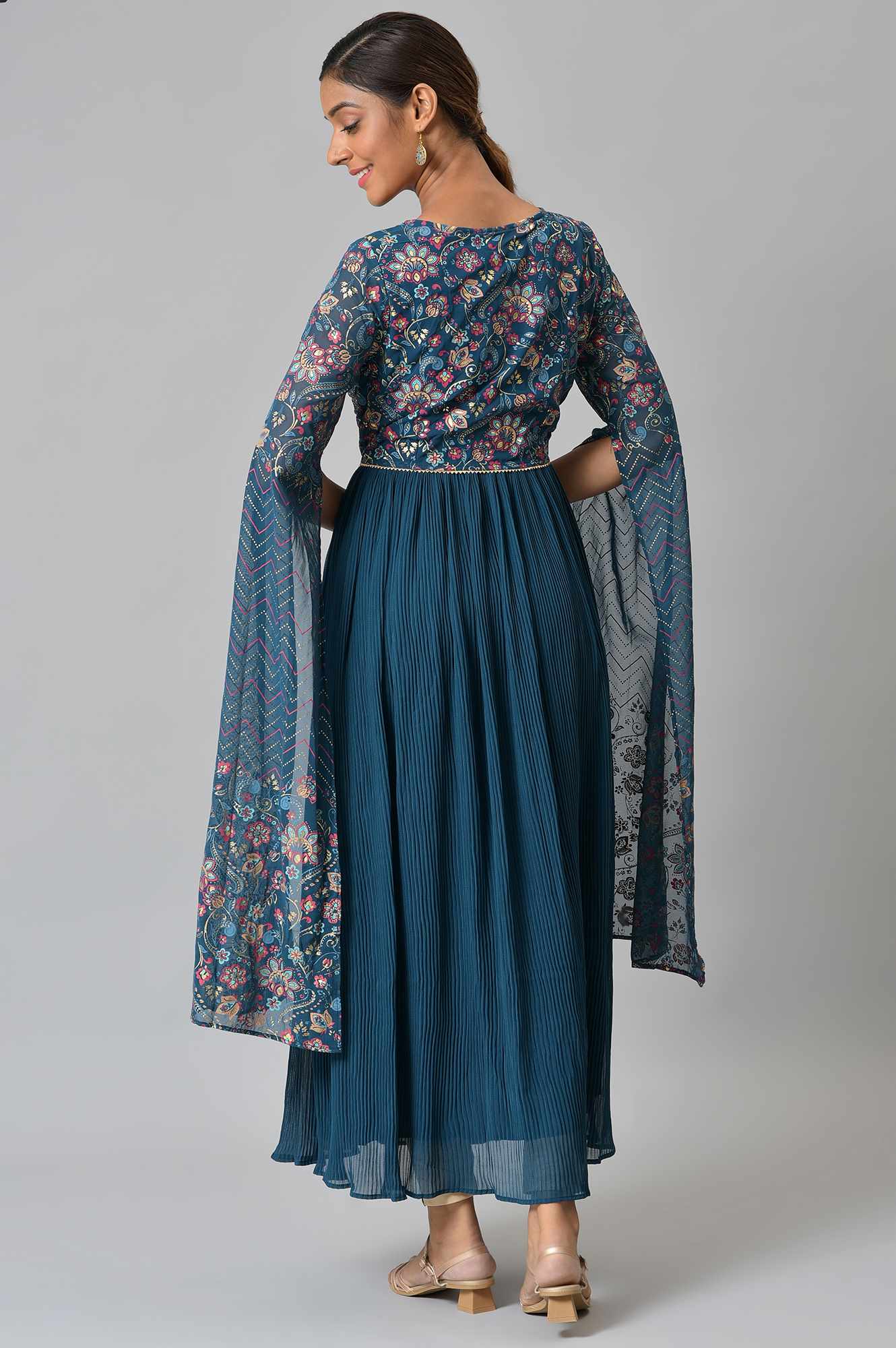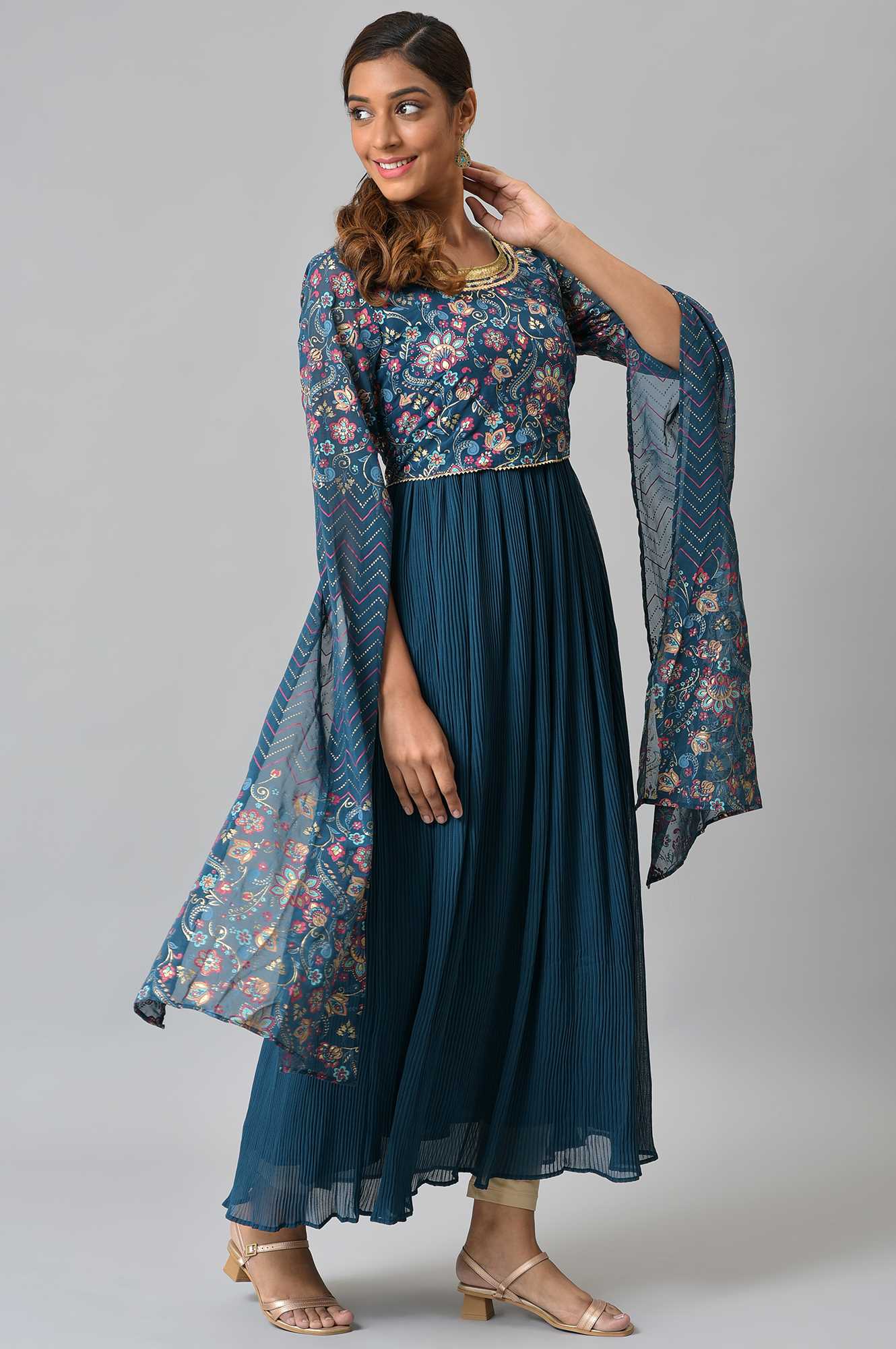 This Festive Season You Will Be An Ultimate Eye-Catcher Just Like Alia In The Evening By Donning This Beautiful Pleated Long kurta. It Has Unique Exagerrated Sleeves That Almost Elongates To The Length Of The Outfit And It Is Amplified In A Mock Double Layered Crop Top With Pleated Georgette Flare. The Print Is An Amalgamation Of Geometric And Floral Motifs Which Gives An Absolutely Modern Edge To The Silhouette.