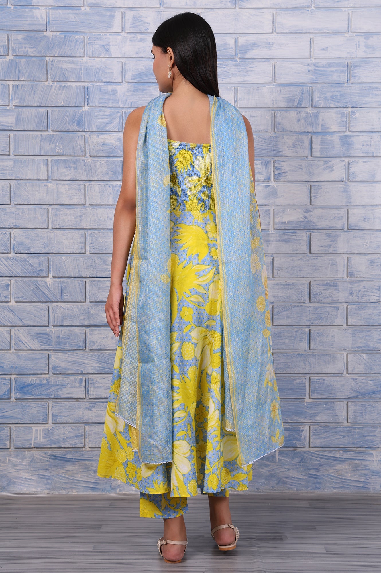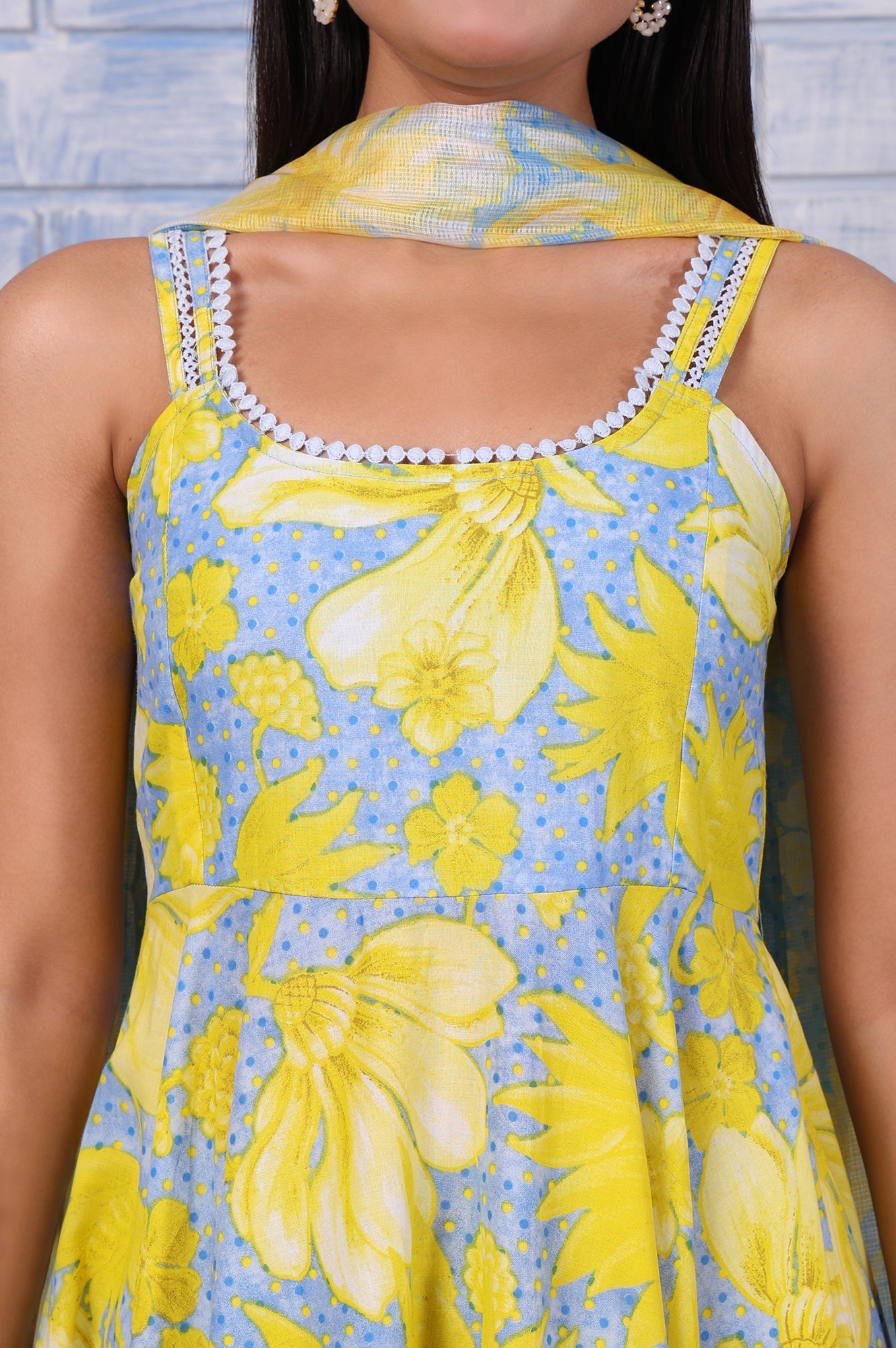 Blue Floral Printed Lace Pure Cotton Flared Kurta, Straight Pant And Dupatta Set