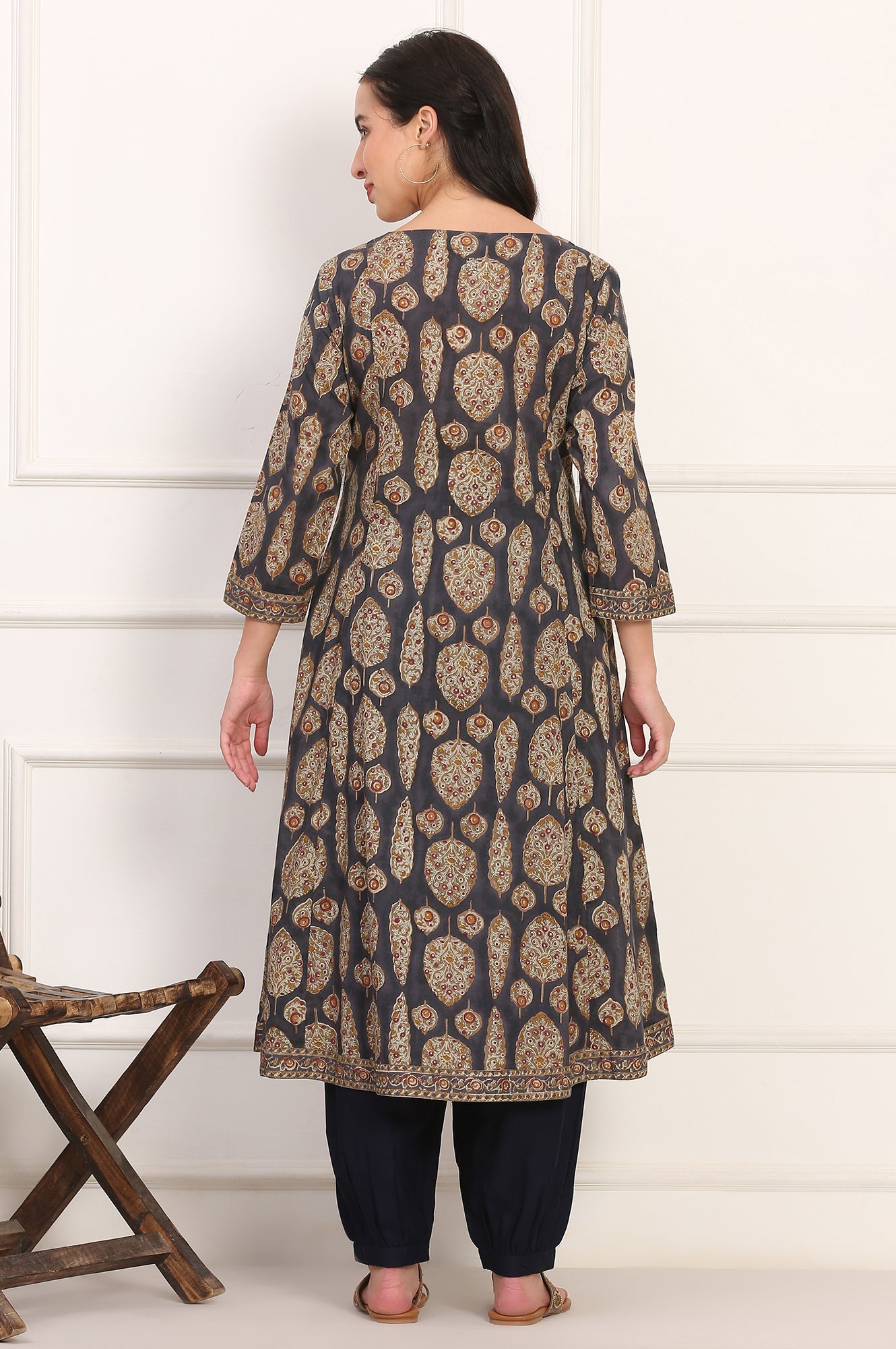 Blue Hand Block Floral Printed Mirror Work Pure Cotton Flared Kurta