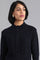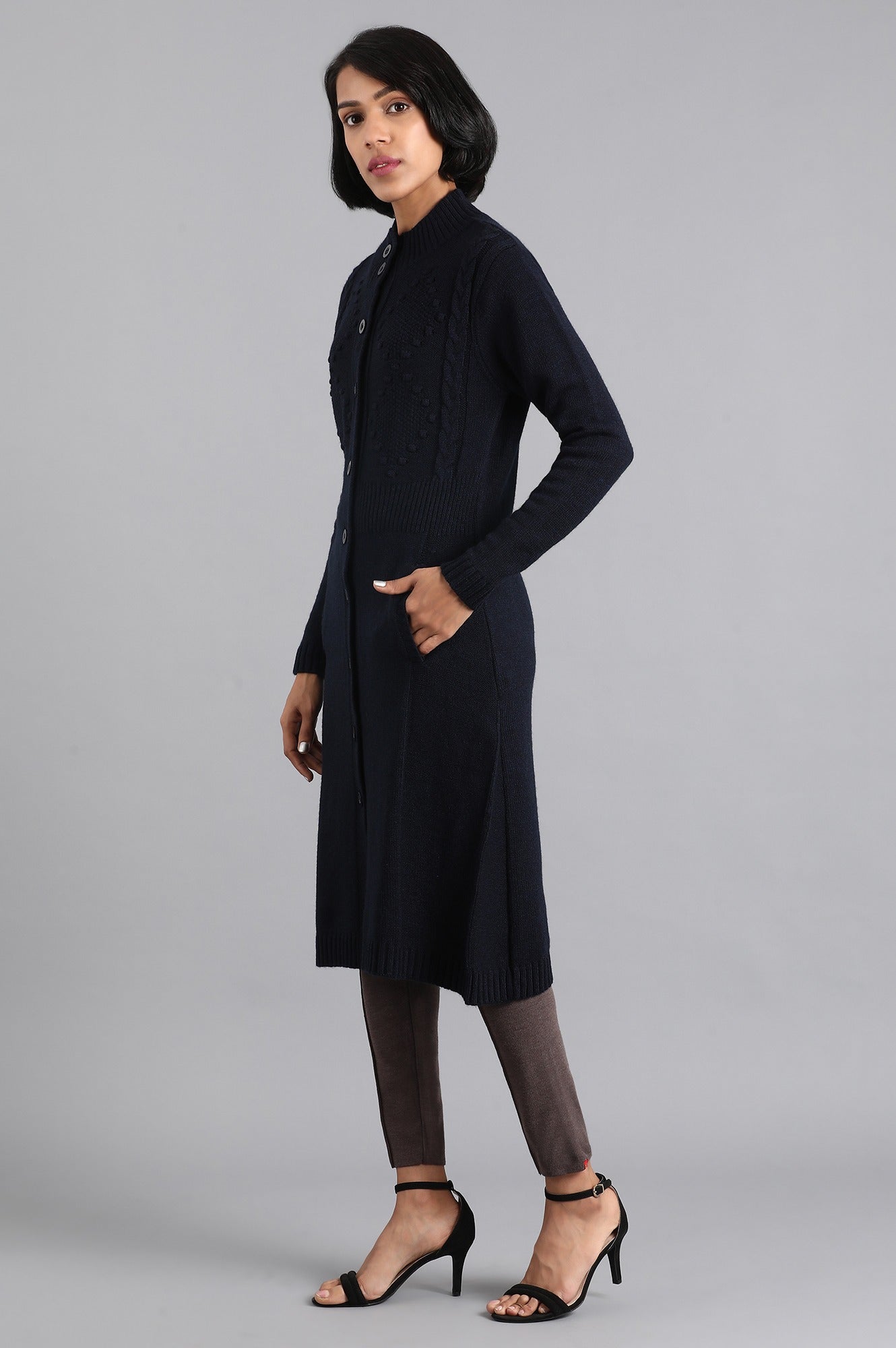 Blue long jacket with cable detail, button placket on the front & pocket detail.