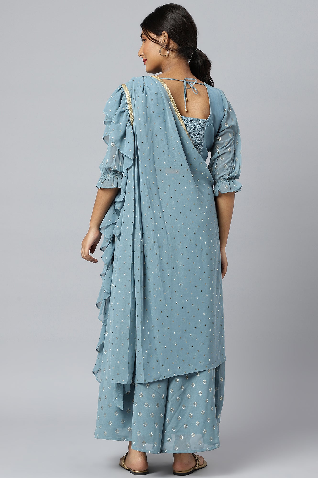 Blue Mist Embroidered Crop Top with Palazzo and Drape