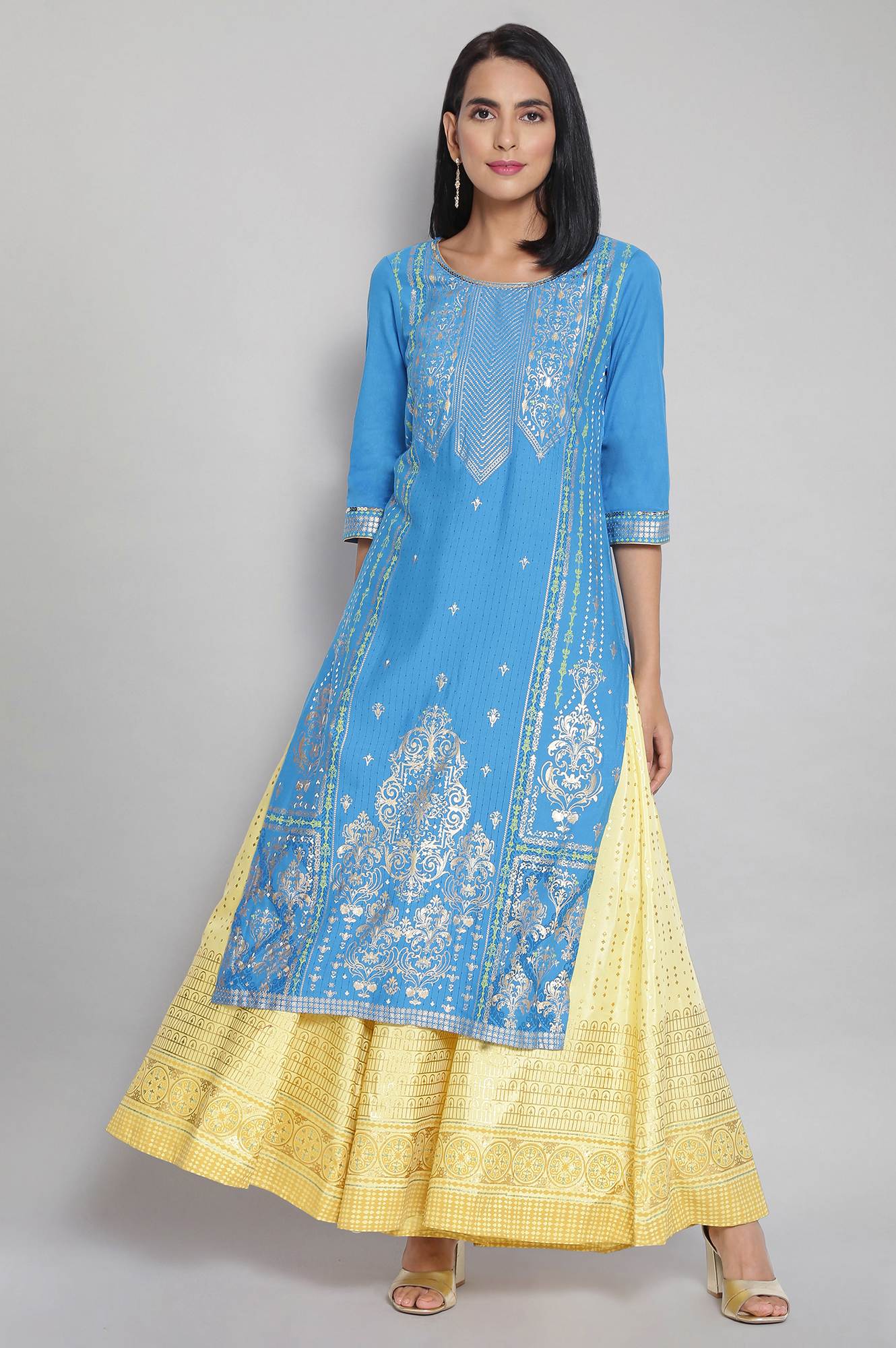 Blue coloured straight kurta having ornamental foil print, sequin embellishment, round neck type, three-quarter sleeves and side slits.