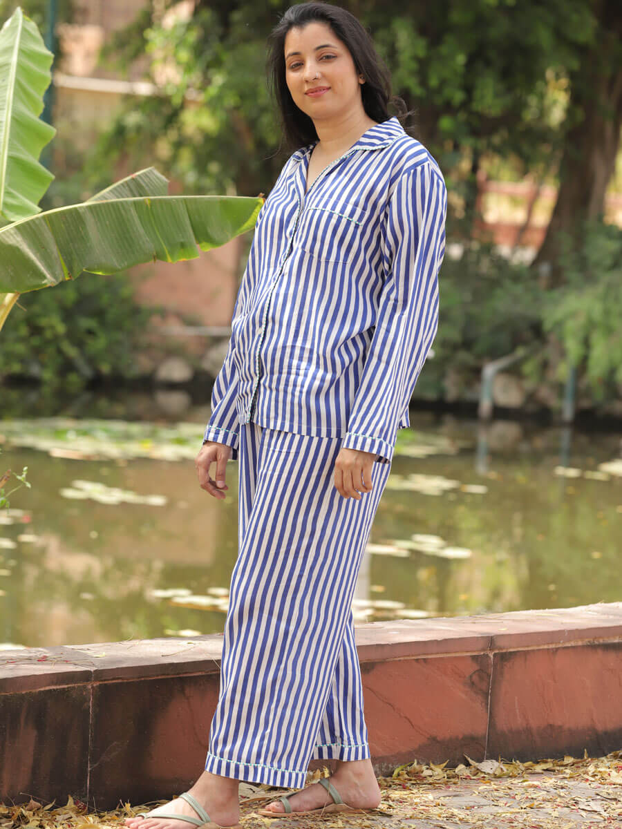 Blue Stripes Block Printed Cotton Top & Pyjama Set
