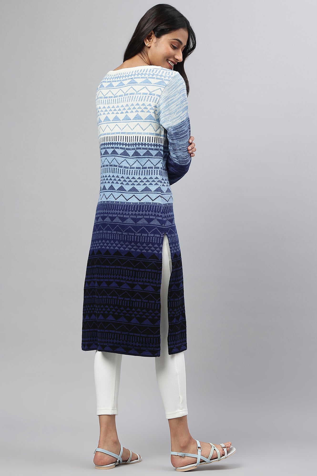 Impactful And Striking, This Is An Engineered Knitted kurta. It Features An Interesting Play Of Ombre In The Base As Well As In The Geometric Motifs. The Sleeves Have Raw Lined Ombre Look To Maintain Continuity.